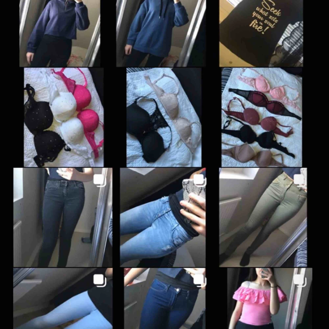 Säljer detta! En croppad och en oversize hoodie. Många bh:n i olika storlekar i spets samt pärlor. Jeans och andra byxor i mjukare material, 3 olika t-shirts och en volangtopp i neonrosa färg. Hör av er för storlek, pris, tydligare bilder☺️🛍