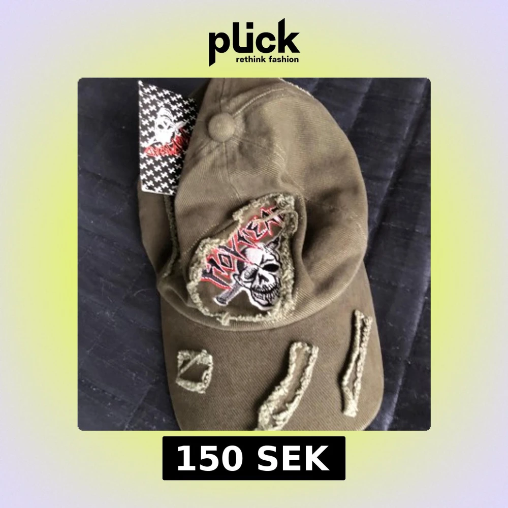 Cool olivgrön keps med ett broderat dödskallemotiv och slitna detaljer. Perfekt för en edgy stil. Märket är okänt men designen är unik och iögonfallande.