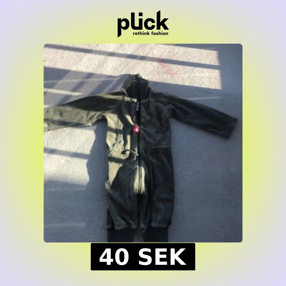 Olivgrön mjukisdress i onepiece-stil med hel dragkedja framtill och ribbade muddar vid benslut. Dressen har snörning i midjan och en röd dragkedjedekor med vit stjärna. Perfekta för chill eller lek.