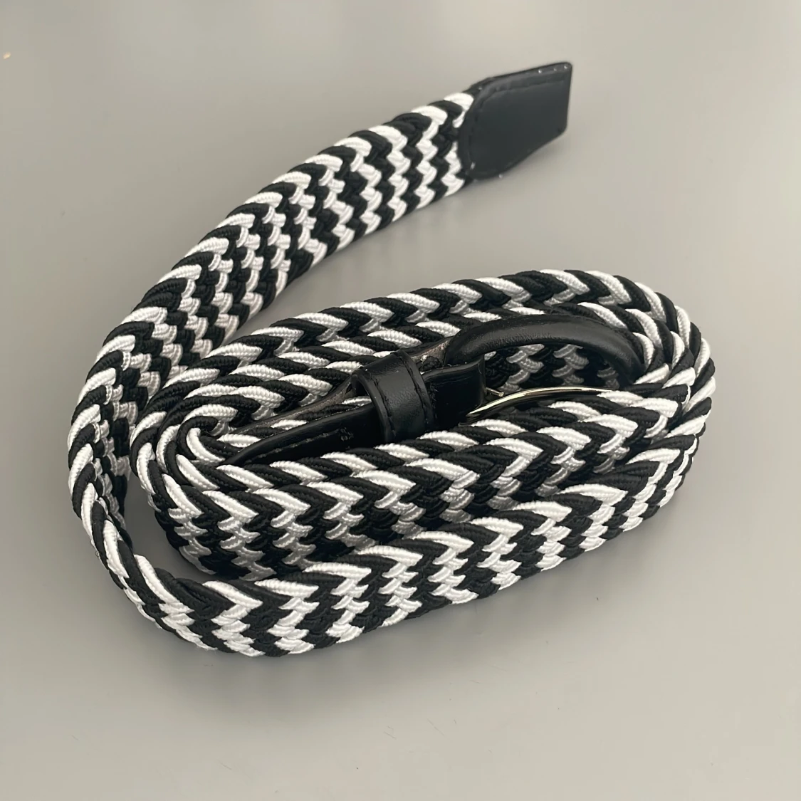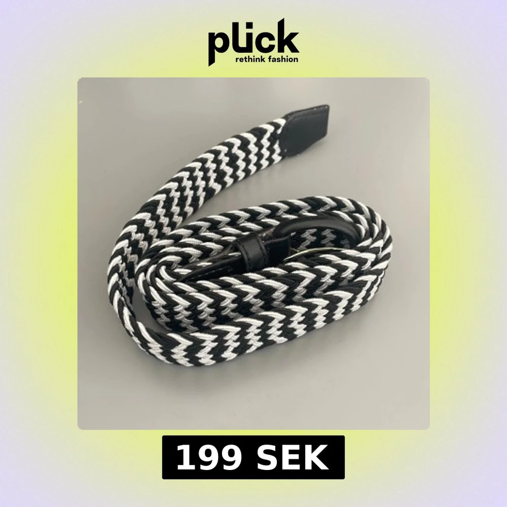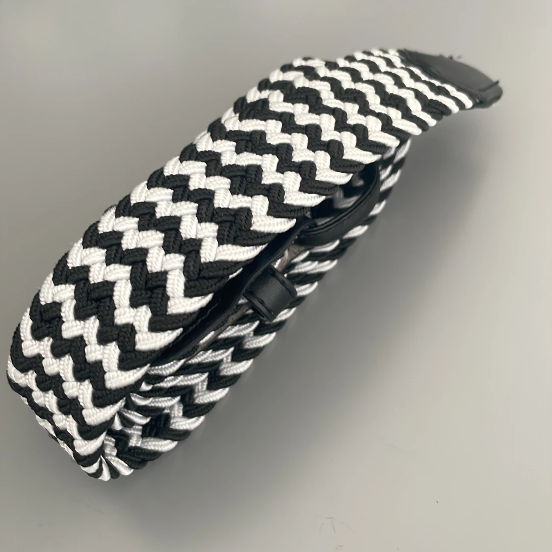 Snyggt svartvitt bälte med flätad design och svarta skinn-detaljer vid spännet. Bältet har ett coolt randigt mönster och är gjort i slitstark textil som ger en modern och sportig vibe. Perfekt för att lyfta vilken outfit som helst med lite extra edge.