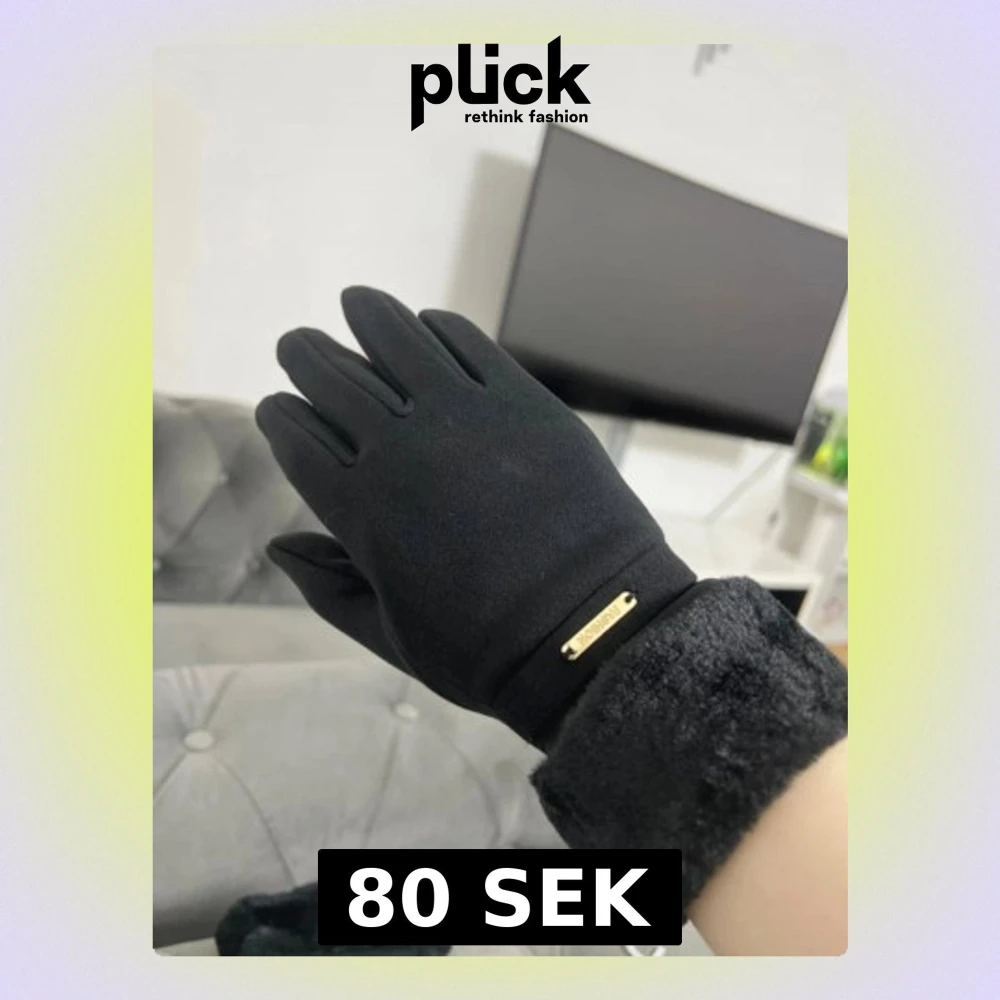 handskar med pälsdetalj vid handleden oc en liten guldfärgad metallbricka, kan använda mobilen med dem💕 nya