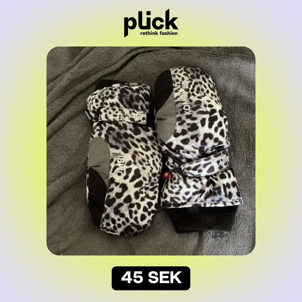 Ett par svartvita leopardmönstrade tumvantar med förstärkta svarta partier på handflatan och tummen. Vantarna har elastiska muddar och justerbara remmar för bättre passform. med Flis material och fingrarna har som ett eget rum typ. använd 1 skidsemester
