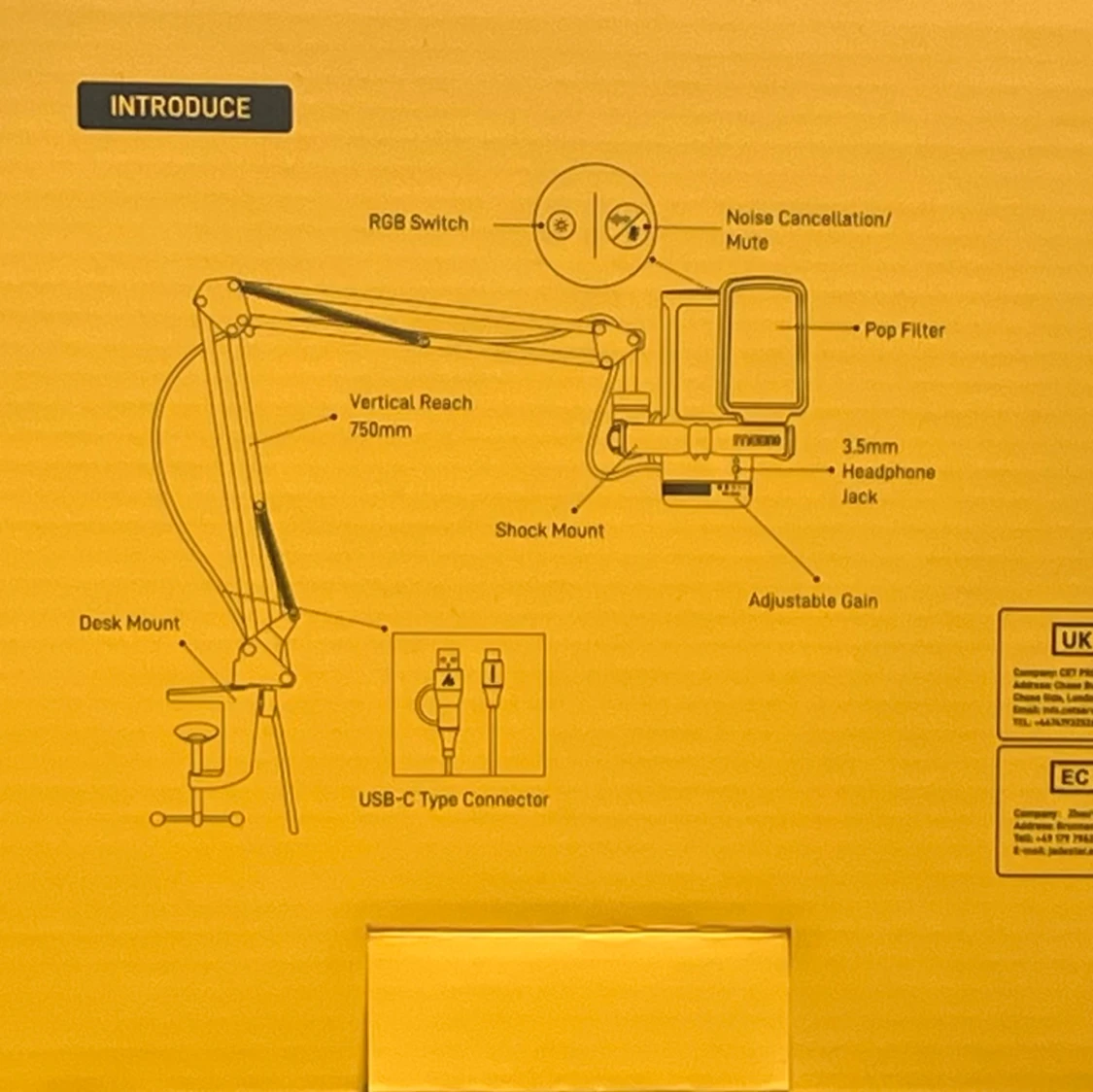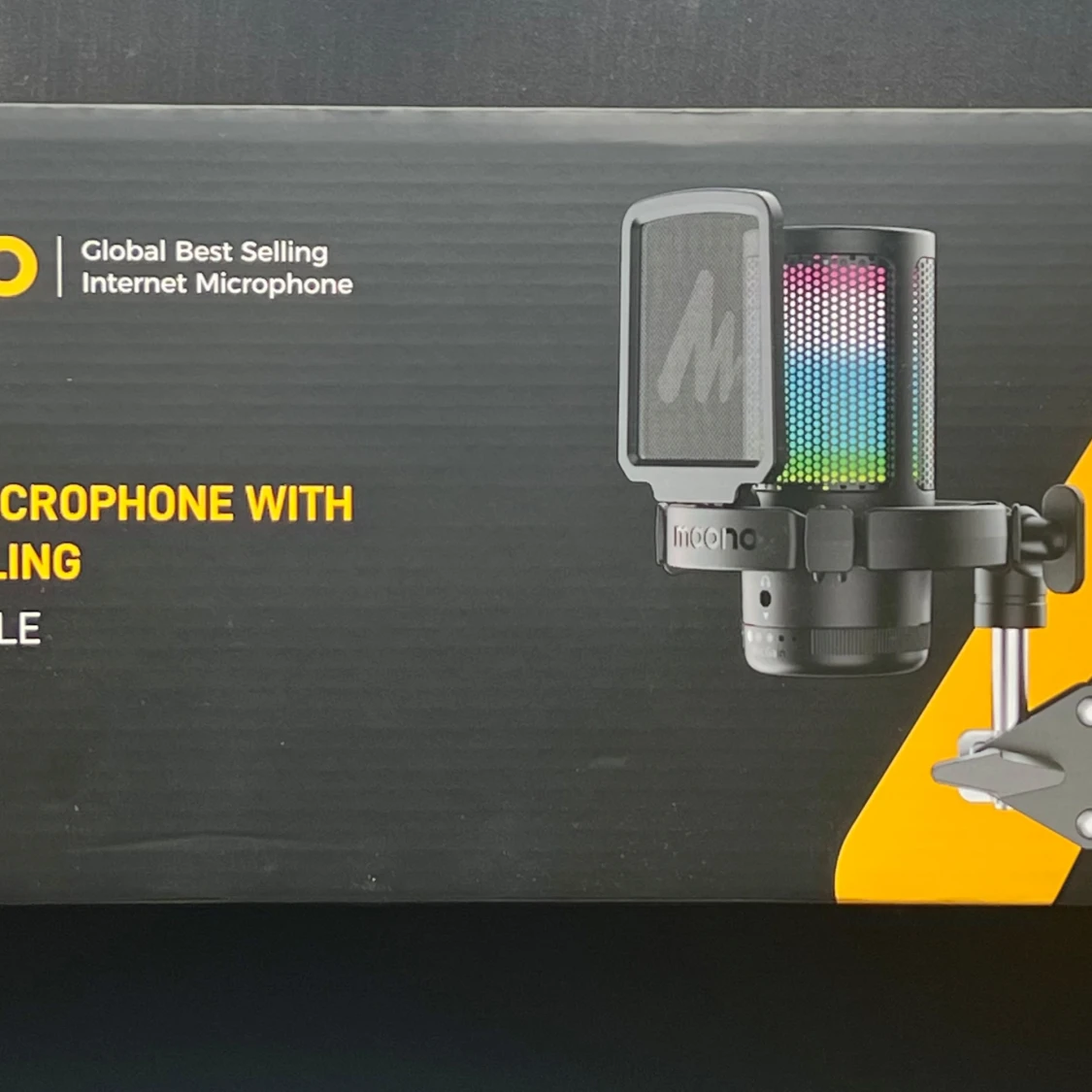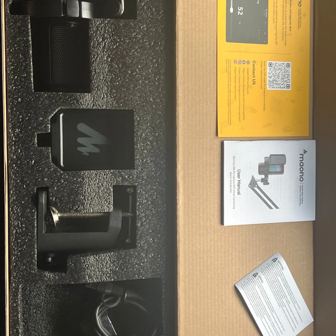 Manualen till Maonos populära internetmikrofon med RGB-belysning, popfilter och justerbar arm. Perfekt för dig som vill ta din streaming, gaming eller podd till nästa nivå! Innehåller tydliga instruktioner och tips för bästa ljudkvalitet.