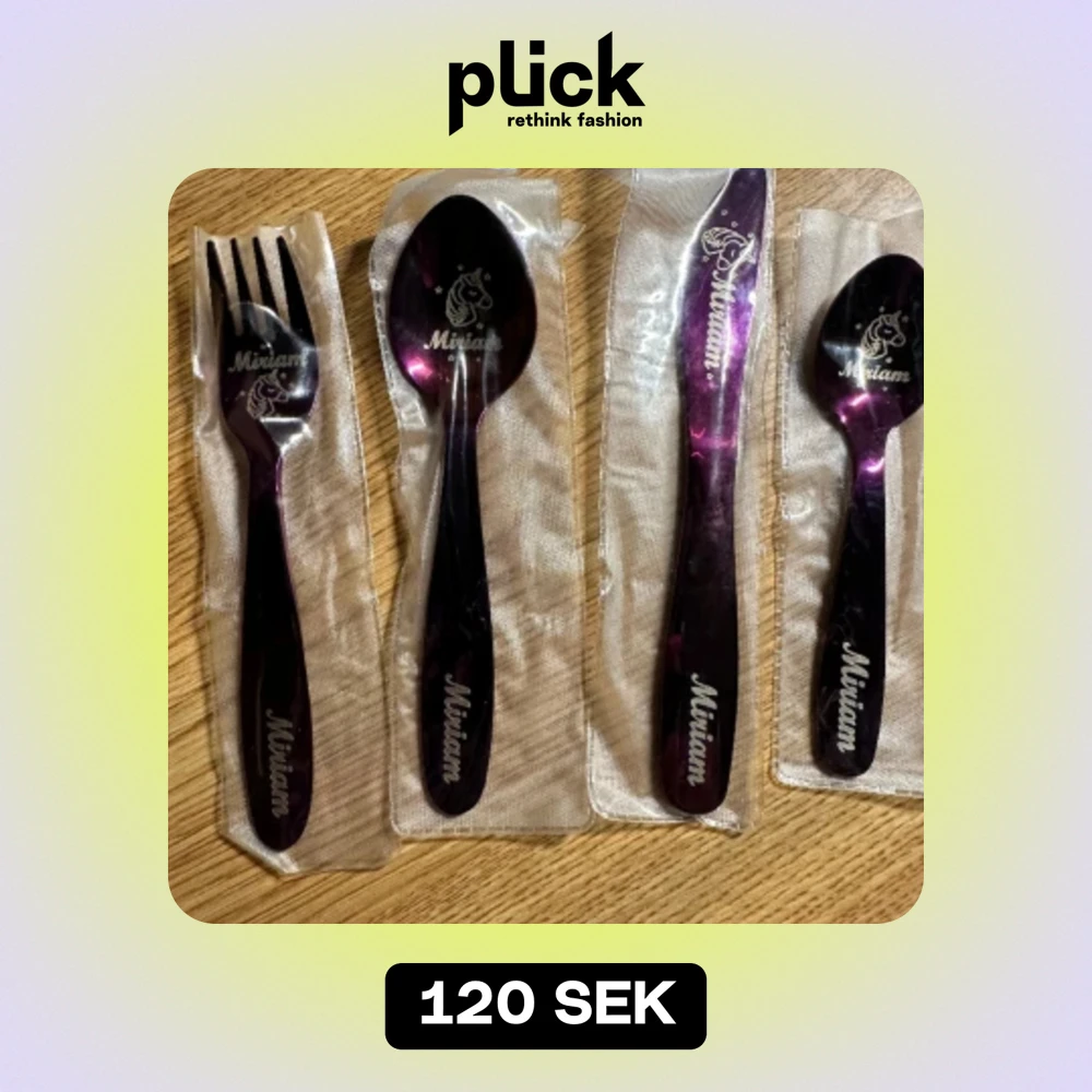 Graverat bestick set med namn Miriam och enhörning. Ett stor sked, gaffel, kniv och liten sked. Riktiga bestick- inte plast för leka. Barn storlek. Perfekt som present. Kommer med lådan. Nytt och oanvänd.
