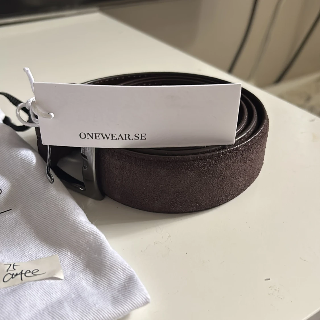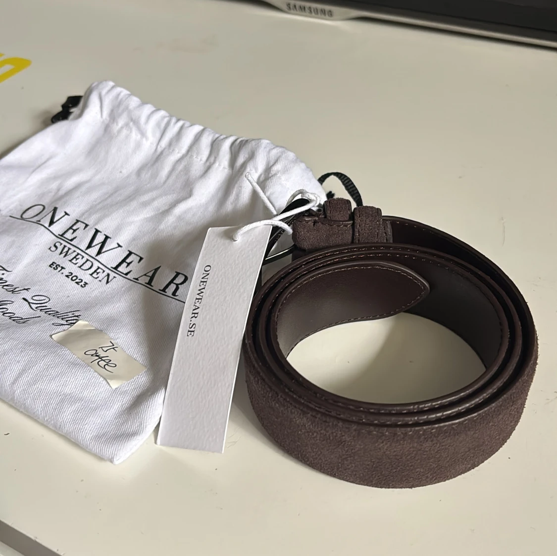 Stilrent brunt bälte i mocka från Onewear Sweden. Bältet har en klassisk design med silverfärgat spänne och kommer i en snygg tygpåse. Perfekt accessoar för att lyfta din outfit med en touch av kvalitet och enkelhet. Fick den i mystery gift men var för liten