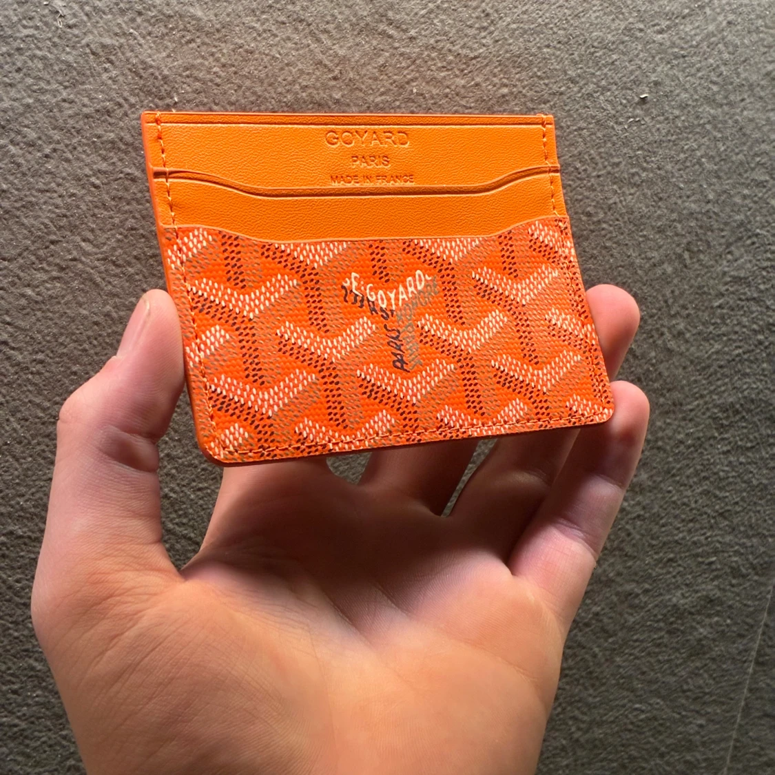 Snygg orange korthållare med ikoniskt mönster och flera kortfack. Tillverkad i skinn material och Perfekt för dig som vill ha något både stilrent och unikt i fickan.