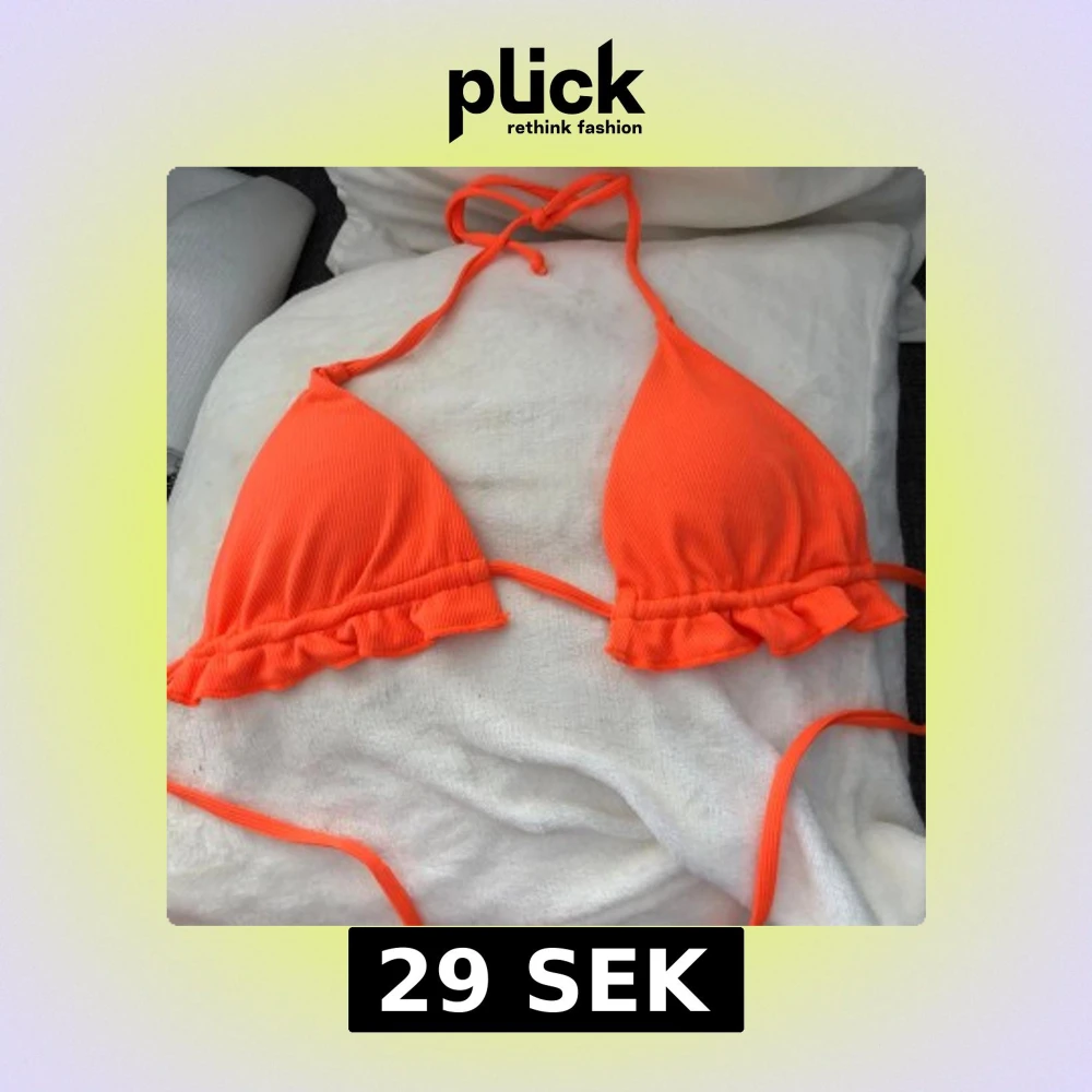 Superfin orange bikini ribbad. Överdelen är en triangelmodell med knyt i nacken och i bak. Aldrig använd. överdelen är S och underdelen är M.