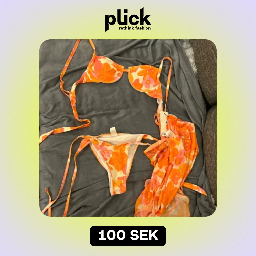 Säljer en superfin bikini med ett färgglatt blommönster i orange. Bikinin har knytband både på toppen och underdelen, vilket gör den justerbar och bekväm. Perfekt för sommarens stranddagar! 🌸