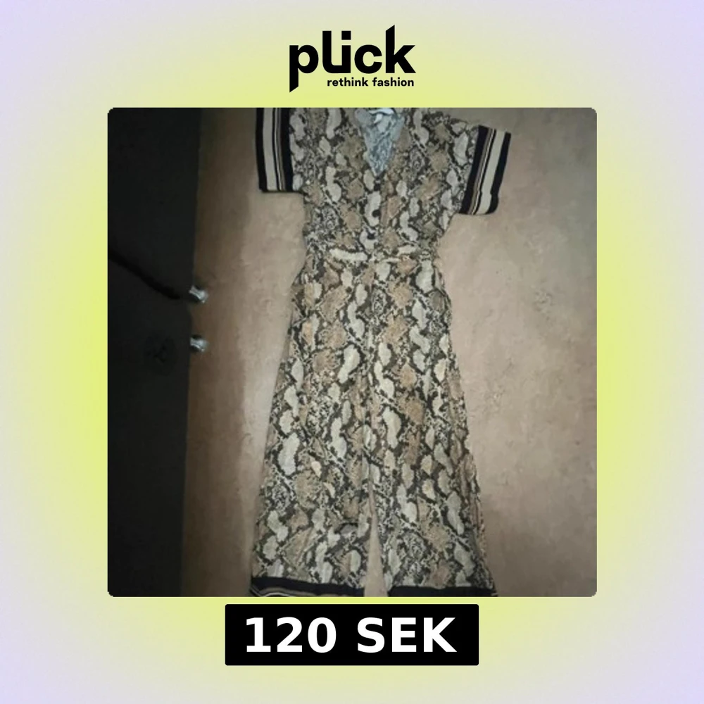 Snygg byxdress med ormmönster i beige, brunt och svart. Vida ben och korta ärmar med svarta och vita ränder. Djup v-ringning framtill och knytband i midjan för extra passform. Perfekt för dig som vill sticka ut med ett coolt mönster.