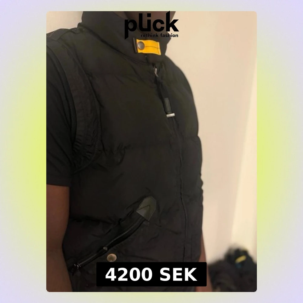 Svart dunväst från Parajumpers med hög krage och gul detalj vid halsen. Västen har dragkedja framtill, två snedställda fickor med dragkedja och knapp, samt ett broderat märke på nacken. Perfekt för lager-på-lager under kyliga dagar. Den är i storlek L. Nyköpt för 5 700kr
