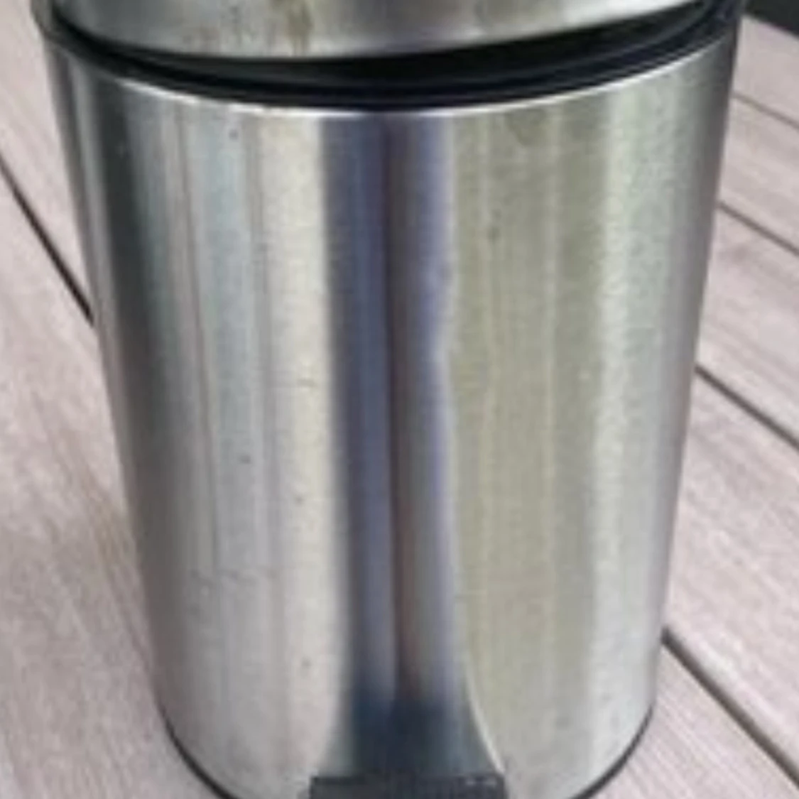 Bilden visar en cylindrisk metallbehållare, troligen en hushållsprodukt som en soptunna. Produkten har en borstad stålyta och ser ut att vara i begagnat skick