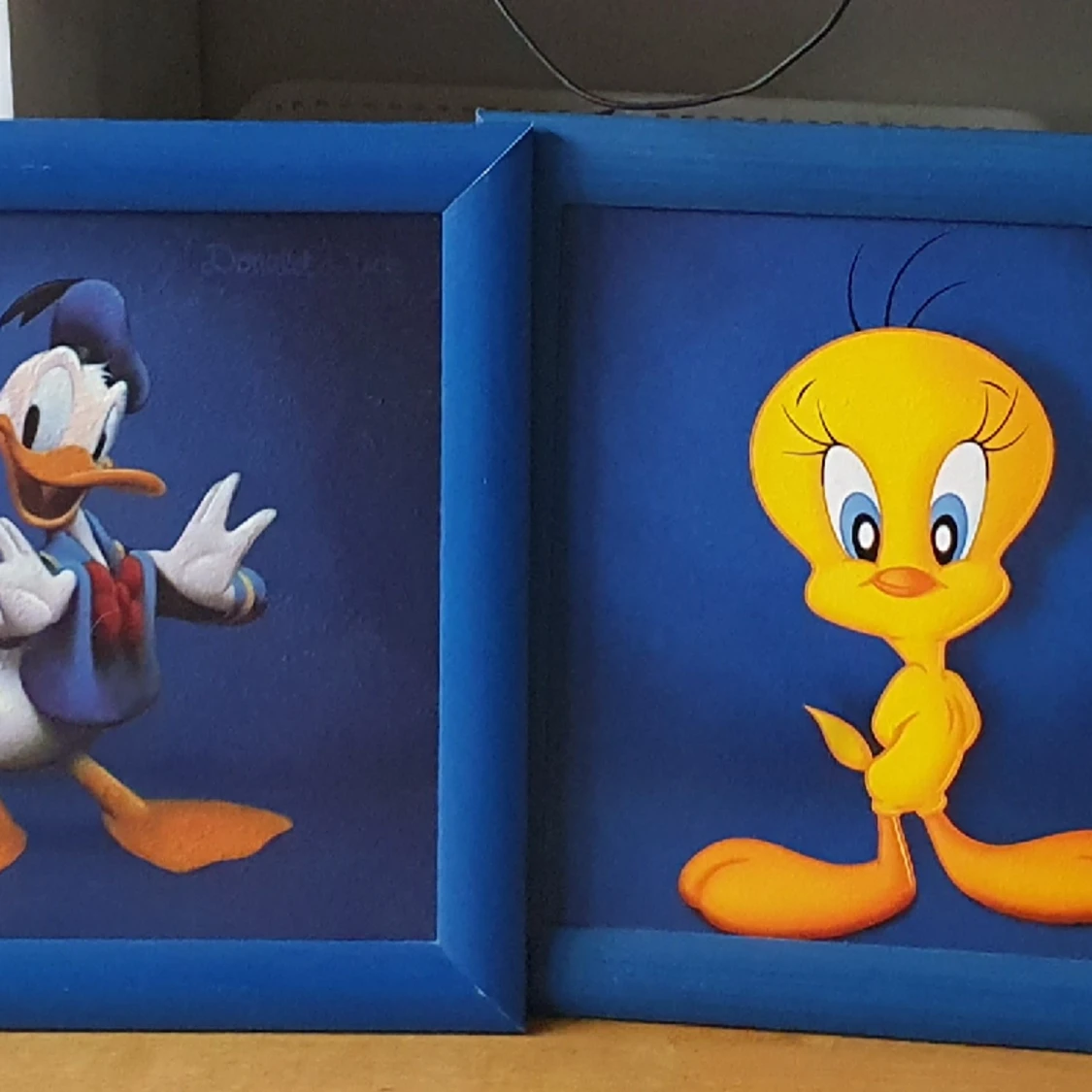 4inramade disneytavlor med blå ram. Målade. I fint skick. Föredrar att de säljes tillsammans. Pris efter överenskommelse.