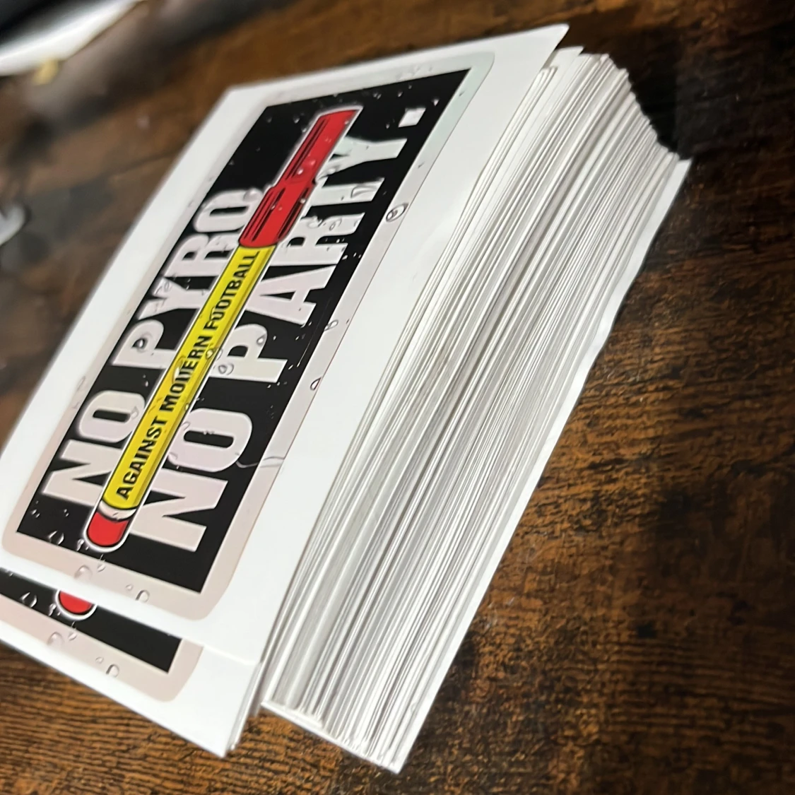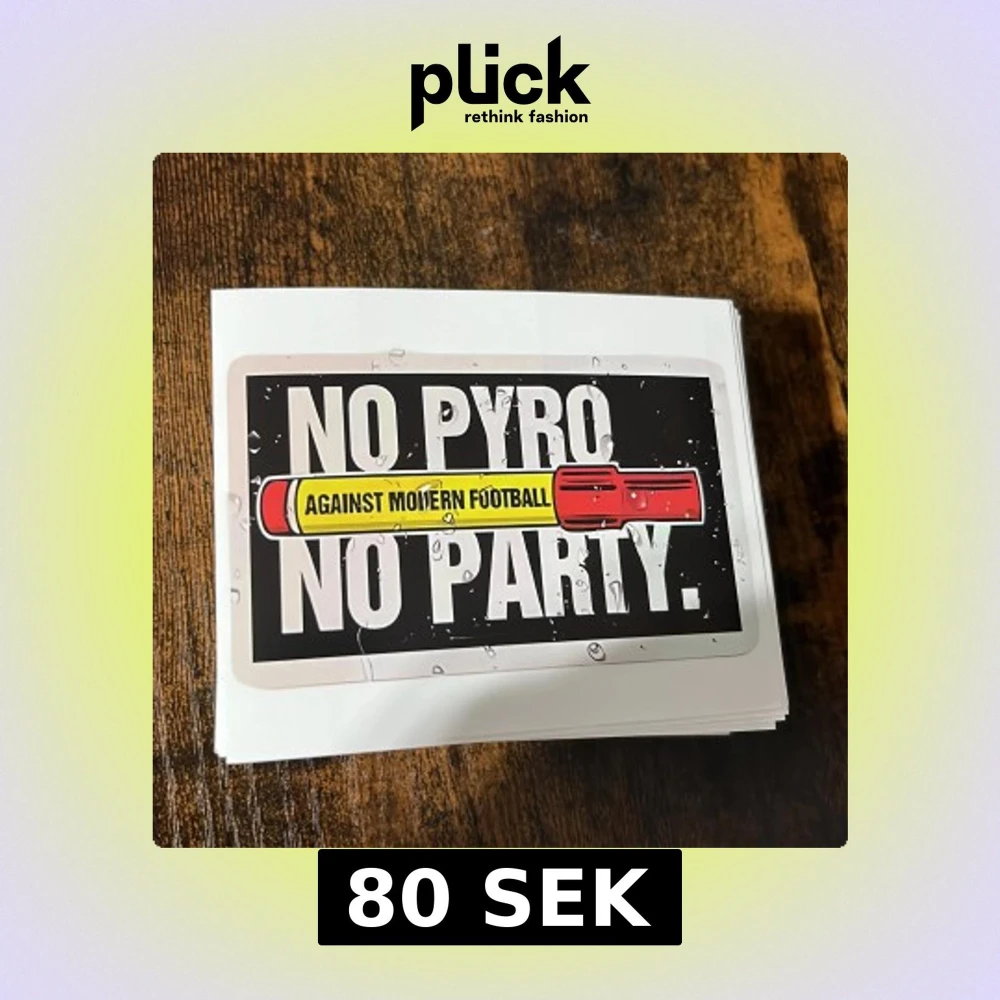 Bilderna visar ett stort antal klistermärken med texten 'NO PYRO NO PARTY' och 'AGAINST MODERN FOOTBALL'. Klistermärkena är i nyskick och har en färgstark design med svart bakgrund och vit text. Perfekt för fans och supporterkultur. Inga synliga defekter eller slitage.