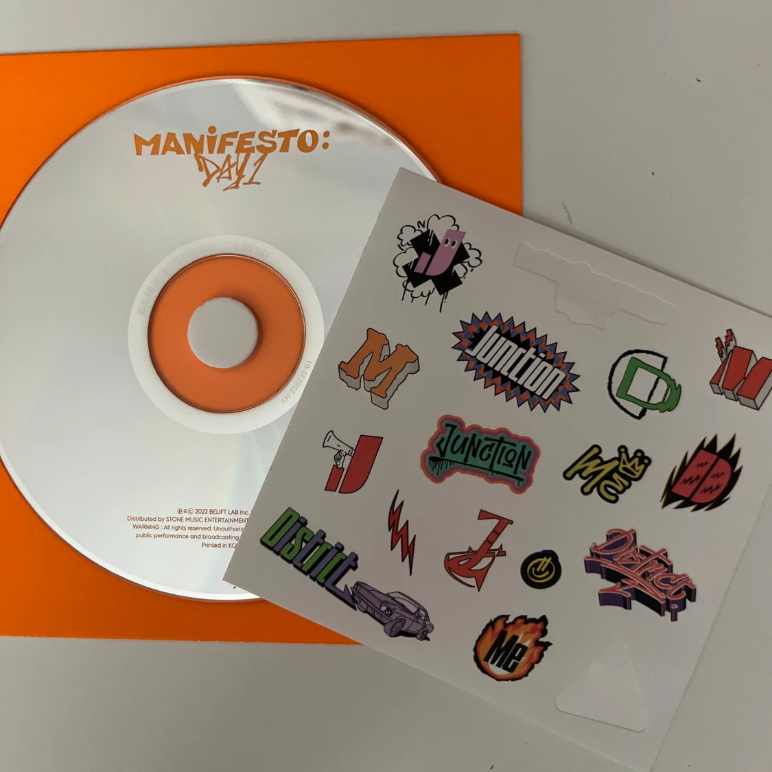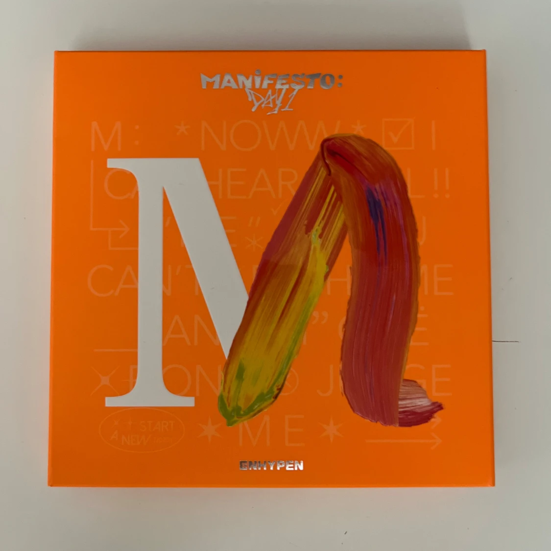 Säljer albumet 'Manifesto: Day 1' av K-popgruppen ENHYPEN. Inkluderar en orange box, CD-skiva, klistermärken och en poster med alla medlemmar. Perfekt för samlare och fans av K-pop och ENHYPEN. Skriv om du har frågor!🫶🏻
