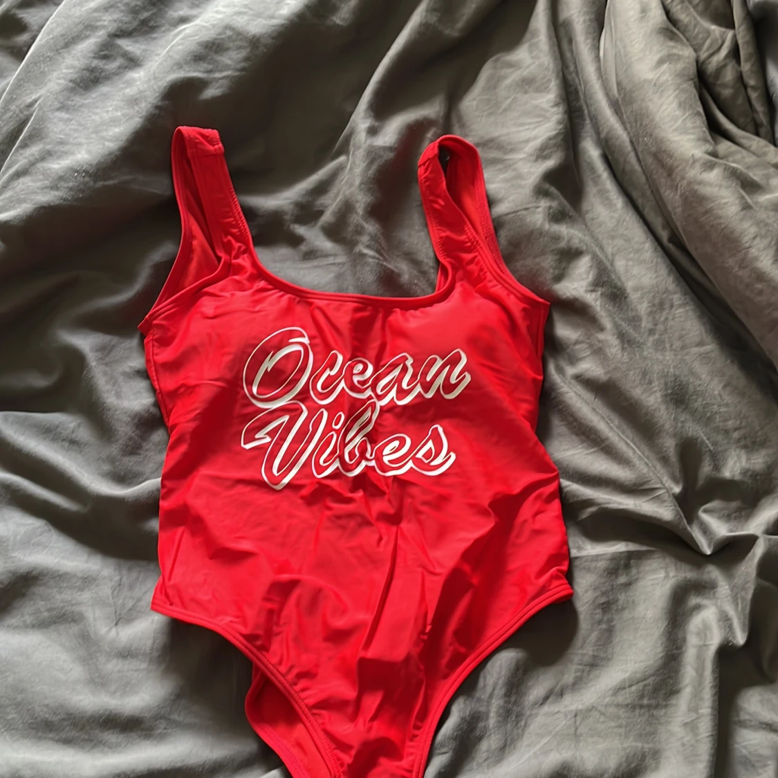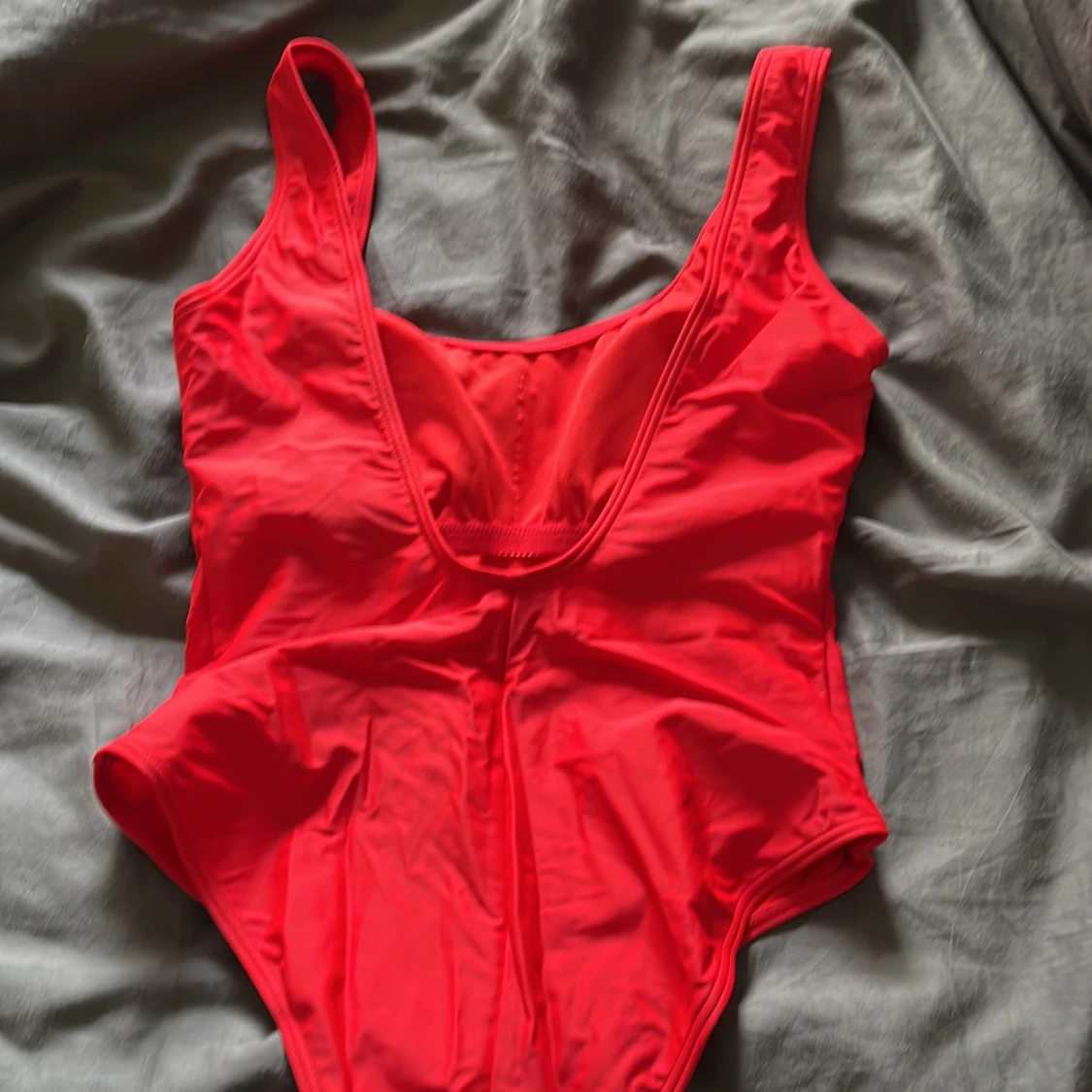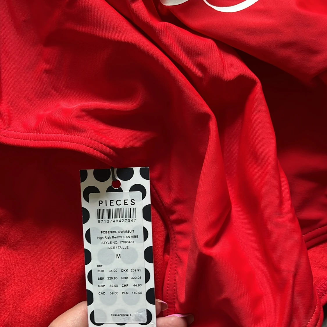 En helt oanvänd röd baddräkt som har prislappen kvar