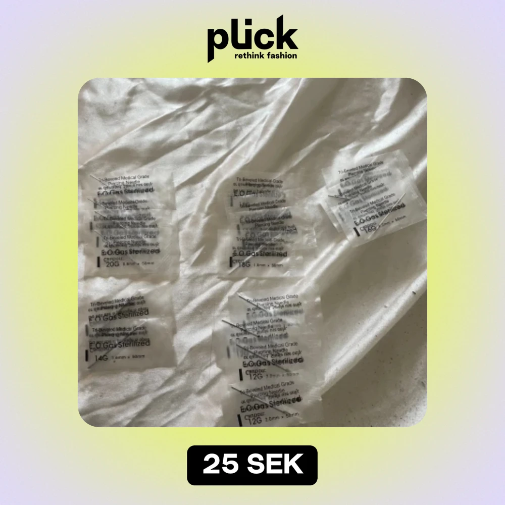 OBS!! SKRIV FÖRST Säljer dessa oanvända/oöppnade piercingnålar. Har 4 20G, 4 18G, 3 16G, 2 14G och 4 12G. De som fattas har jag själv använt och det har funkat jättebra. Säljer 1 nål för 25, 2 för 40 och alla för 250kr!
