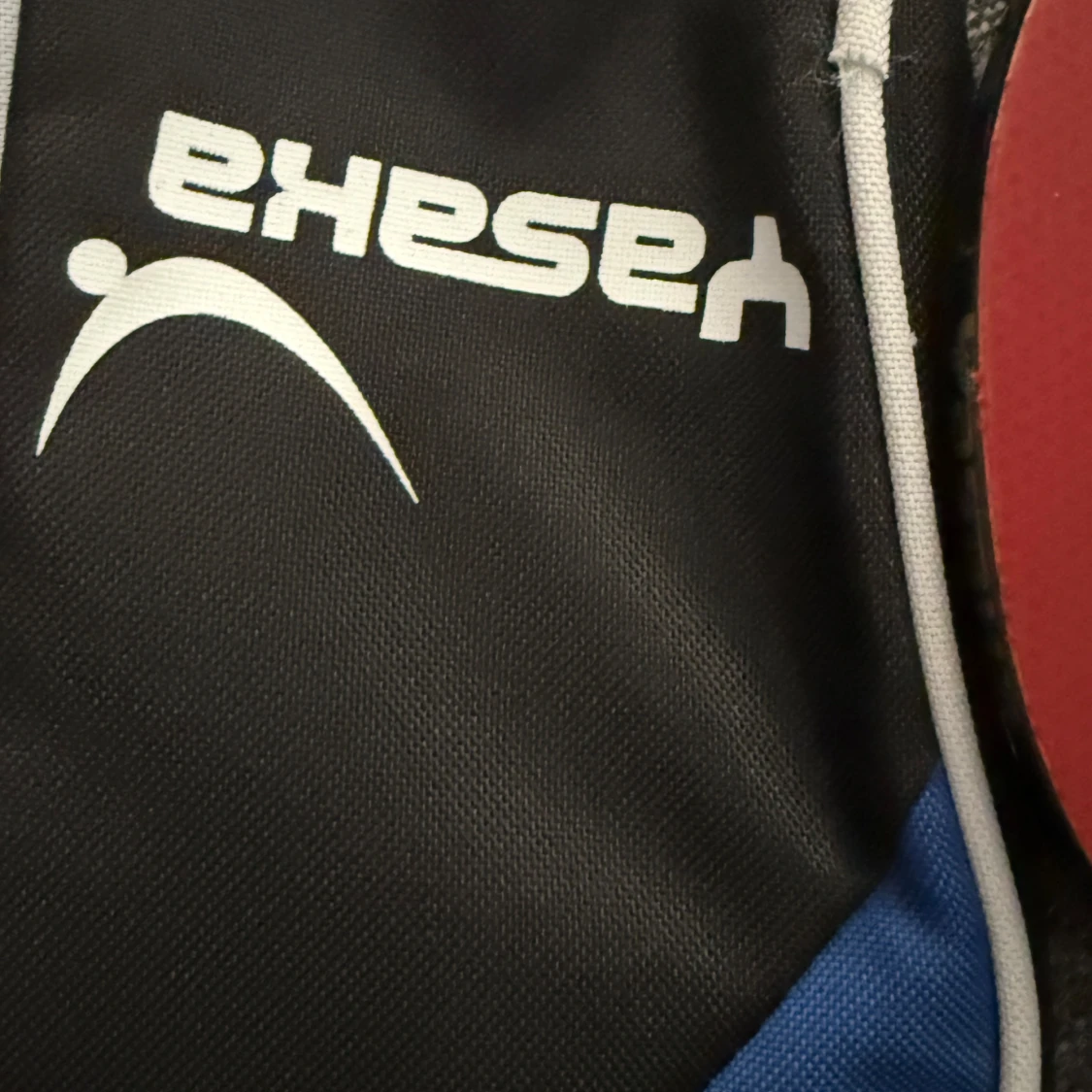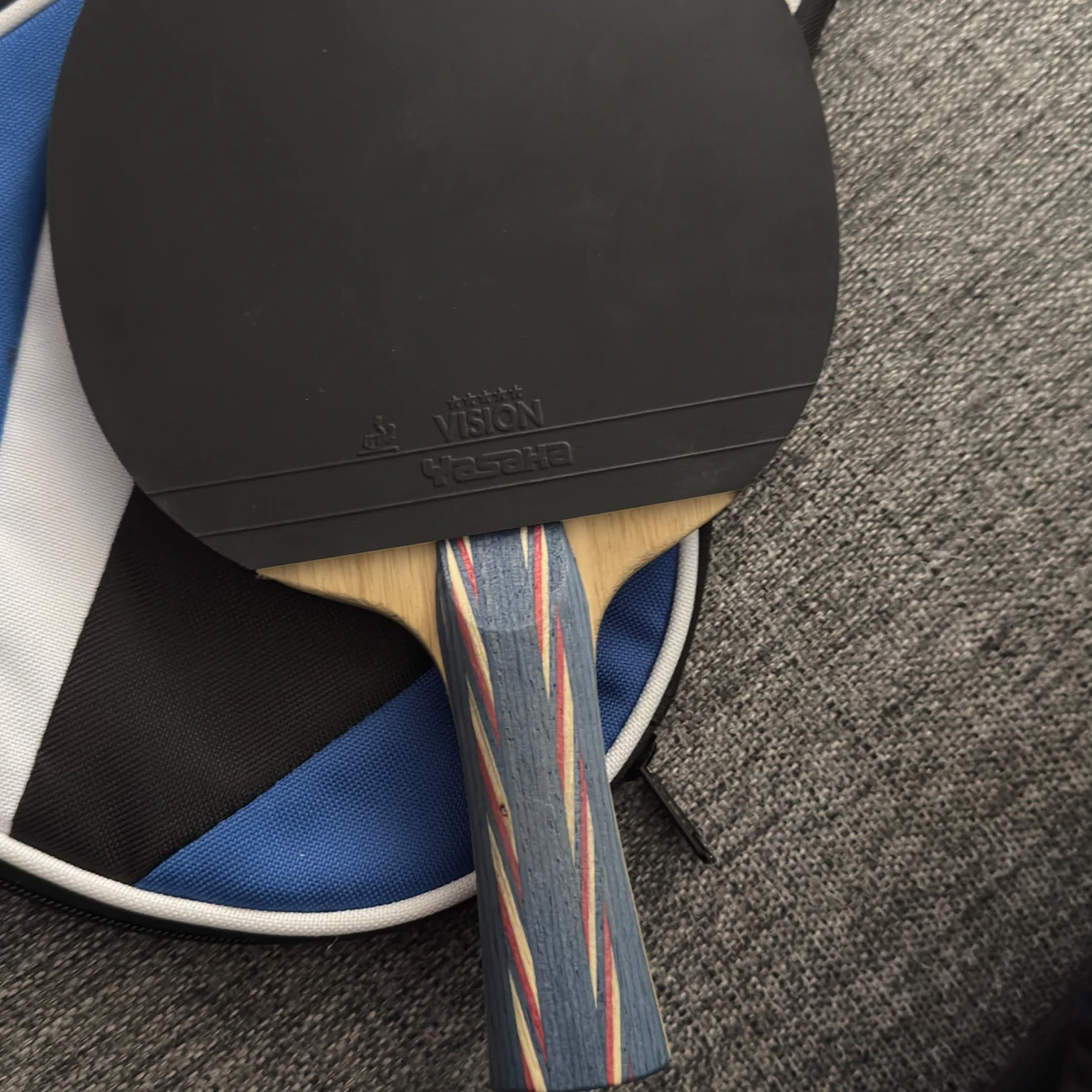ett pingisracket av märket Yasaka med tillhörande fodral. Racketen har en röd och en svart sida, båda märkta med 'Vision Yasaka'. Perfekt för dig som vill ta ditt bordtennisspel till nästa nivå, oavsett om du är nybörjare eller mer erfaren.