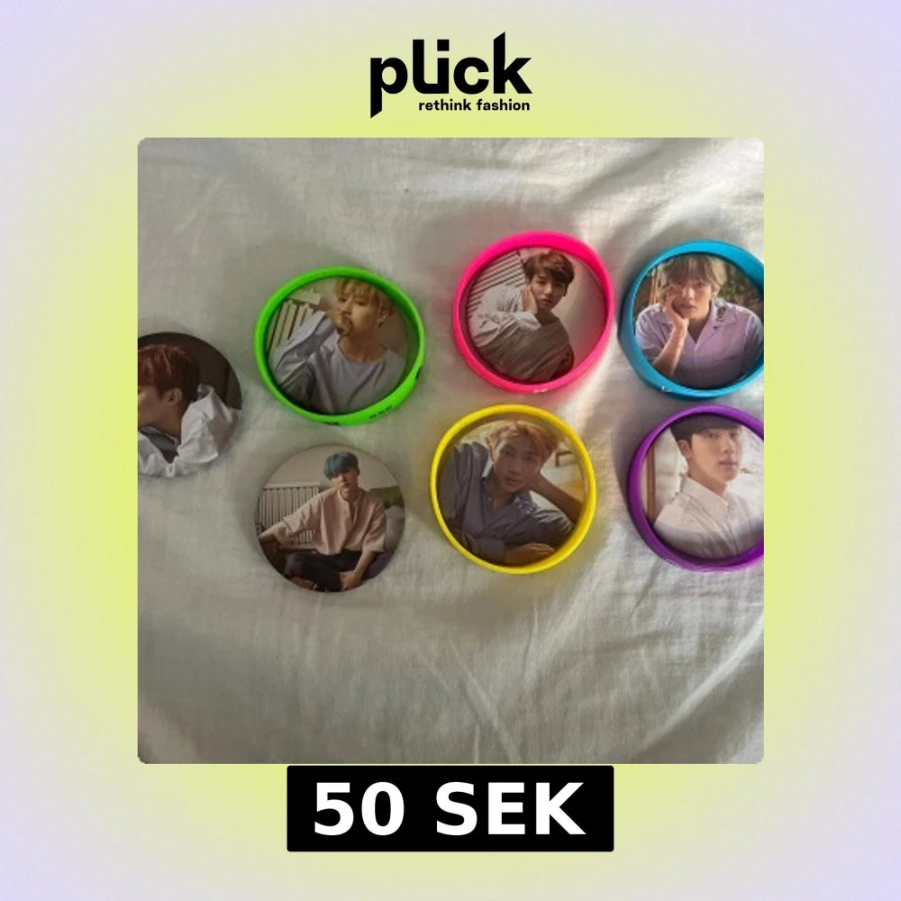 Säljer ett färgglatt set med fem BTS armband i silikon med namntryck (Jimin, Jung Kook, V, RM, Jin) och matchande pins med idolbilder. Armbanden är i neonfärger: grön, rosa, blå, gul och lila. Pinsen är runda med säkerhetsnål på baksidan. Perfekt för dig som älskar K-pop och BTS! Jag säljer mer BTS saker på min profil så gå och kika!