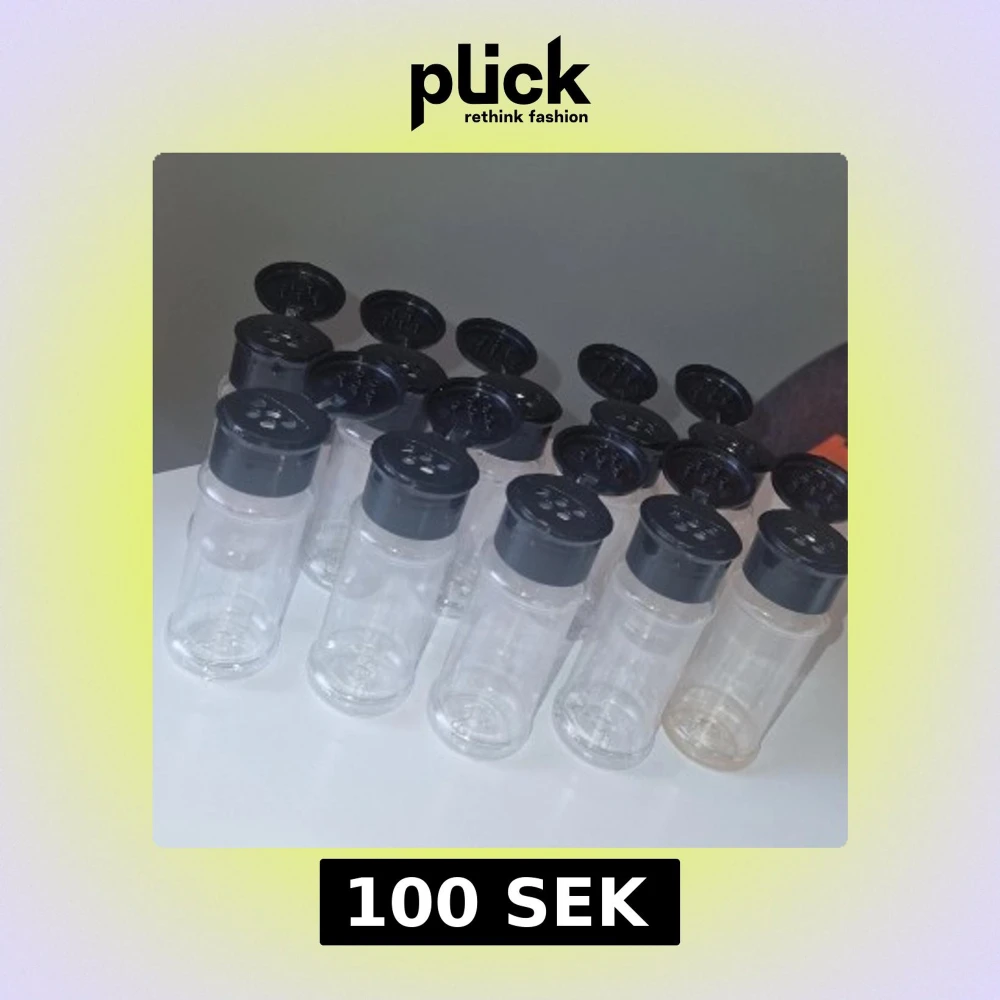 10 st transparenta plastburkar med svart lock och hål för ströning, perfekta för kryddor och torrvaror. Burkarna är använda under kort tid men diskade, en burk är fortfarande är röd av chili pulver då jag inte hade en borste som fick plats i de för att kunna skrubba. Alla burkar är i mycket fint skick, inga defekter eller slitage.