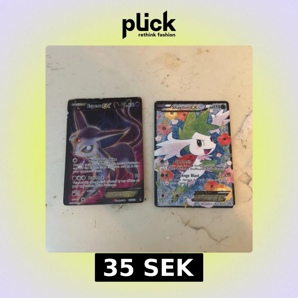 Två coola Pokémon EX-kort: Espeon EX med mörk, mystisk design och Shaymin EX med färgglad blomsterbakgrund. Perfekt för samlare eller dig som vill boosta din lek med unika och kraftfulla kort. Skapa din egen Pokémon-legend!