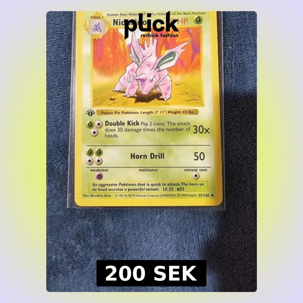 Säljer ett klassiskt Nidorino-kort från Pokémon Base Set, nummer 37/102. Kortet har en gul ram, motiv av Nidorino i rosa/lila nyanser och tydliga attacker som Double Kick och Horn Drill. Perfekt för samlare eller dig som vill uppgradera din kortlek.