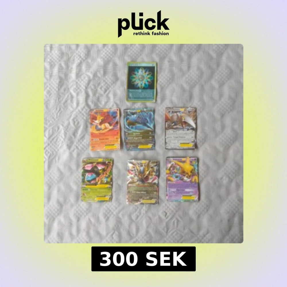 Samling med 7 coola Pokémonkort, inklusive flera EX och holografiska specialkort. Perfekt för dig som vill boosta din samling eller spela med unika och kraftfulla kort. Korten är i fint skick och passar både samlare och spelare som älskar Pokémon.