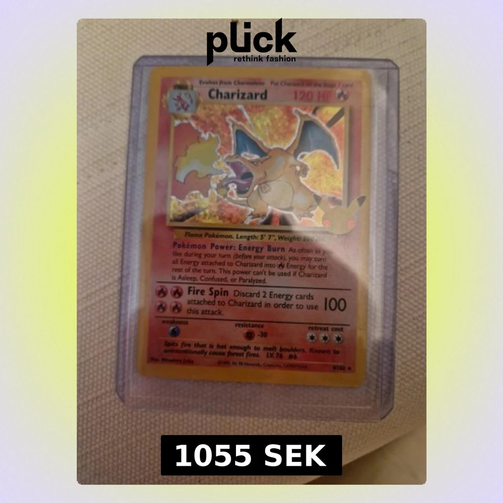 Klassiskt Charizard-kort från Pokémon, Base Set, med holografisk effekt. Perfekt för samlare och nostalgiker! Kortet är skyddat i plastficka och har cool retrodesign. En ikonisk favorit bland unga och gamla Pokémon-fans.