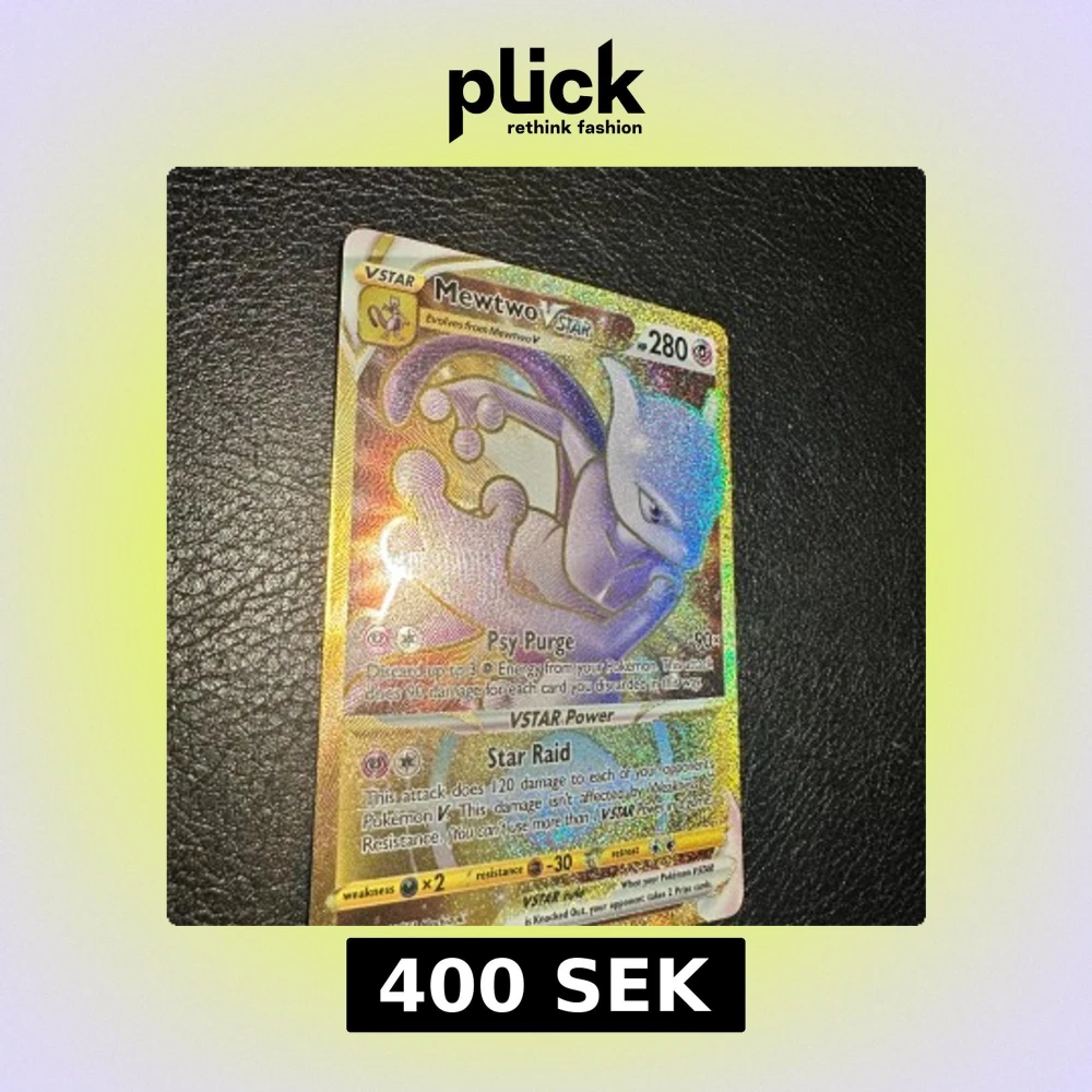 Säljer ett holografiskt Pokémonkort med Mewtwo VSTAR. Kortet har en glittrig yta och visar Mewtwo i lila och silver med guldiga detaljer. Kortet har attacker som Psy Purge och Star Raid samt 280 HP.