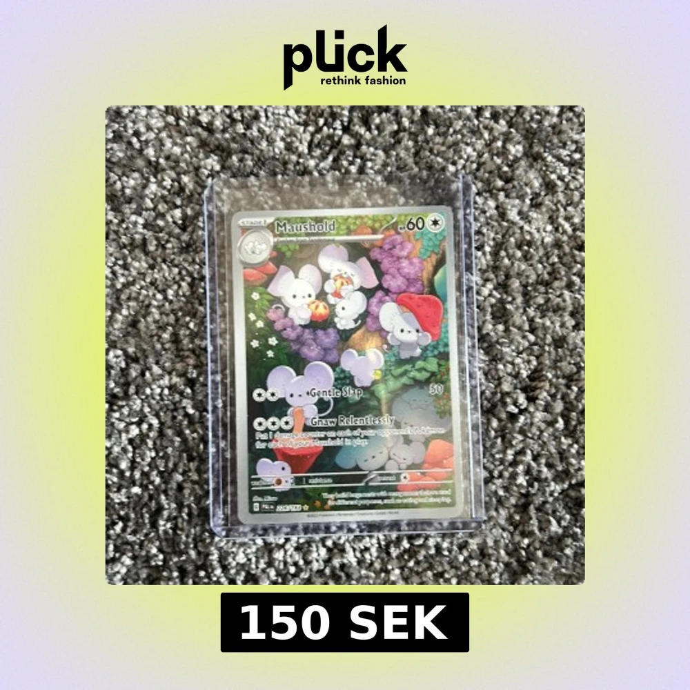 Samlarvänligt Pokémonkort med Maushold, illustrerat i färgstark och lekfull stil. Perfekt för unga samlare och fans av Pokémon som vill utöka sin kortlek med en unik och charmig karaktär.