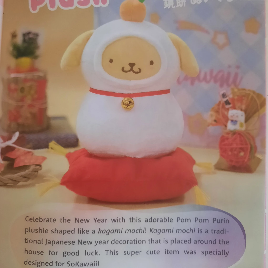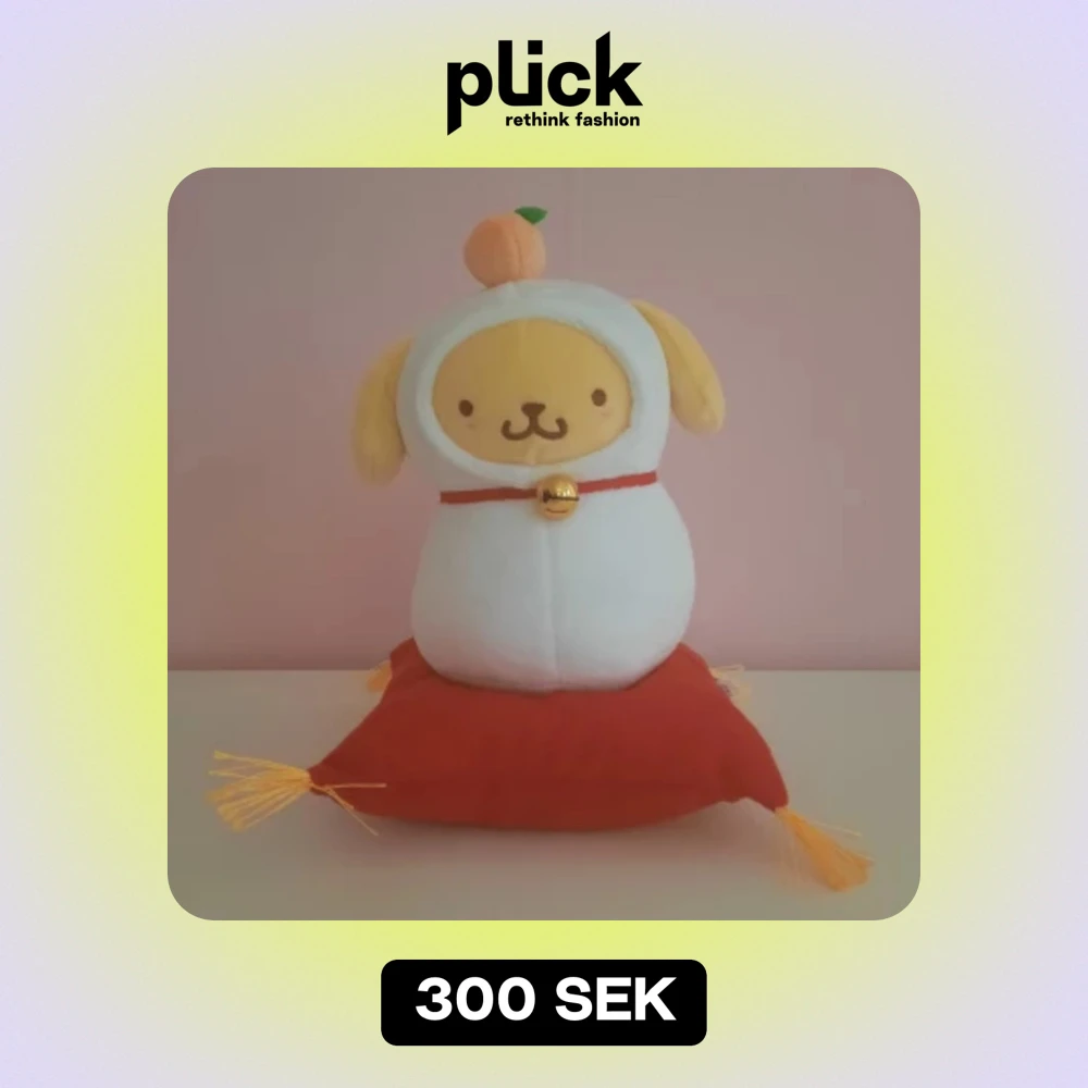 Sanrio Pompompurin plush importerad från Japan från en Sokawaii subscription box. Den har en riktig bjällra som låter när man rör den och en liten ficka på baksidan där man kan lägga något litet. Meddela om du har frågor :)