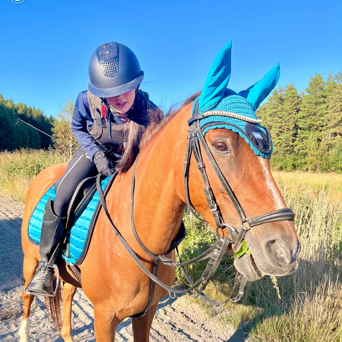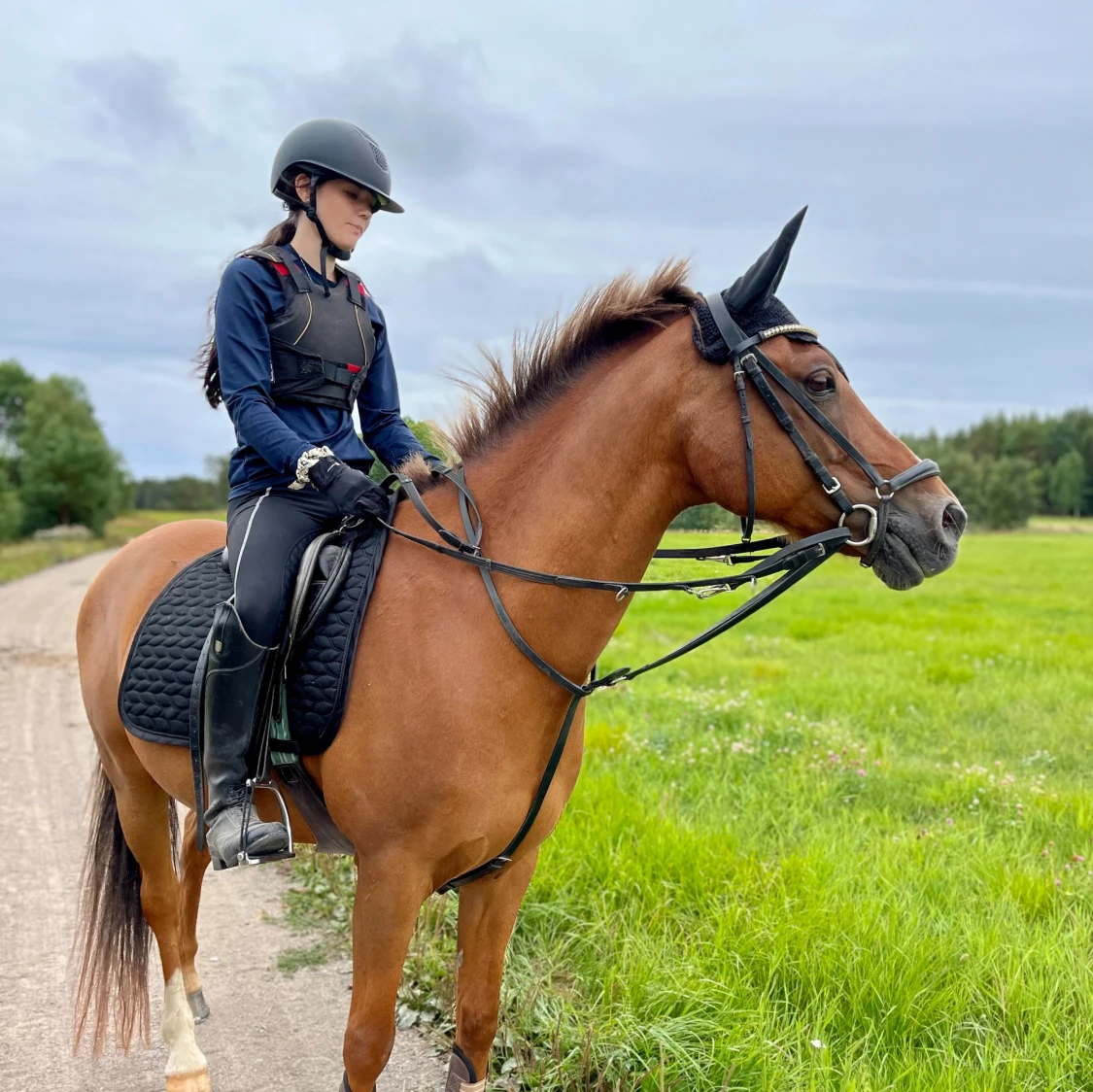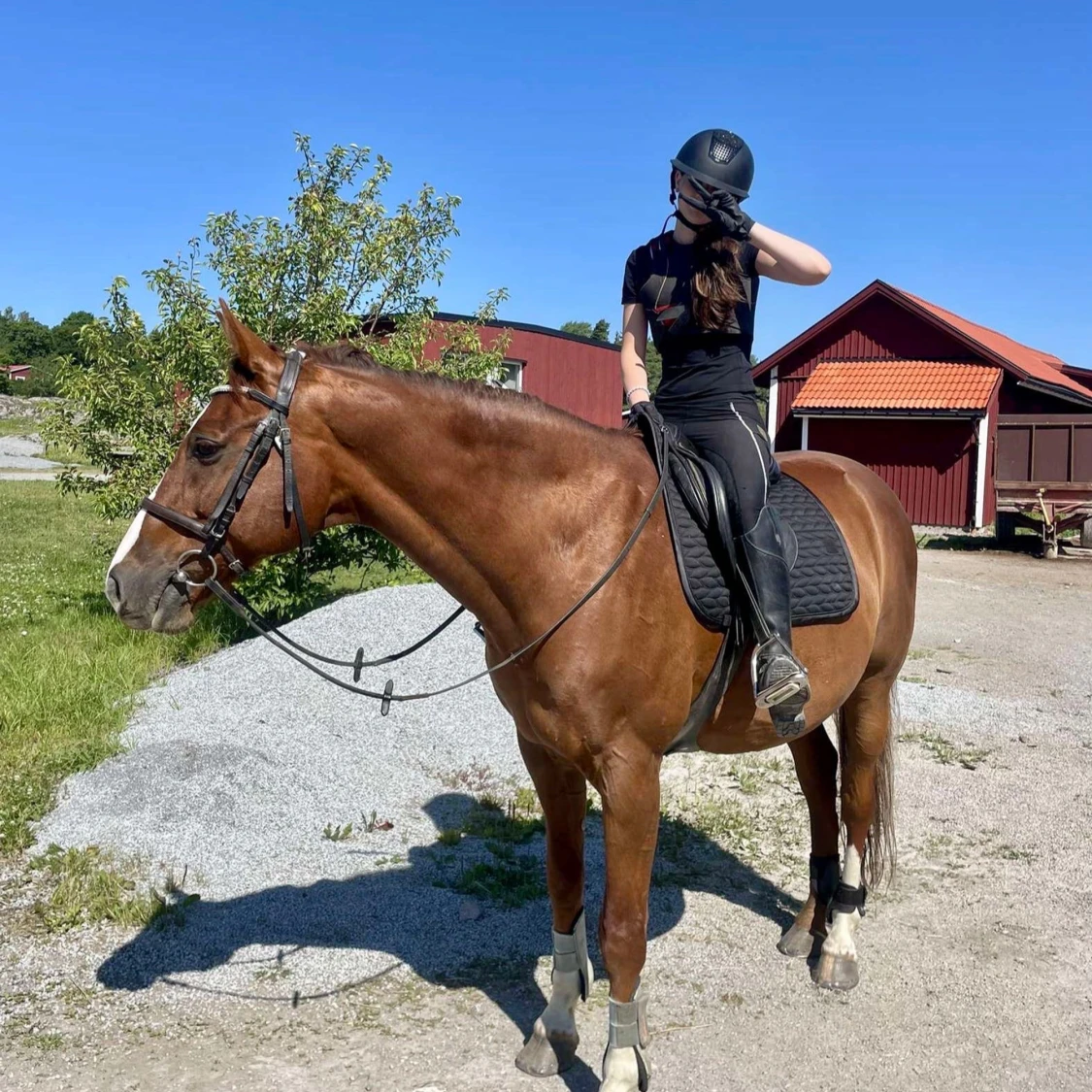 Snygg och säker svart ridhjälm med glittrande detaljer på ovansidan. Perfekt för ridning och ger en stilren look samtidigt som den skyddar.
