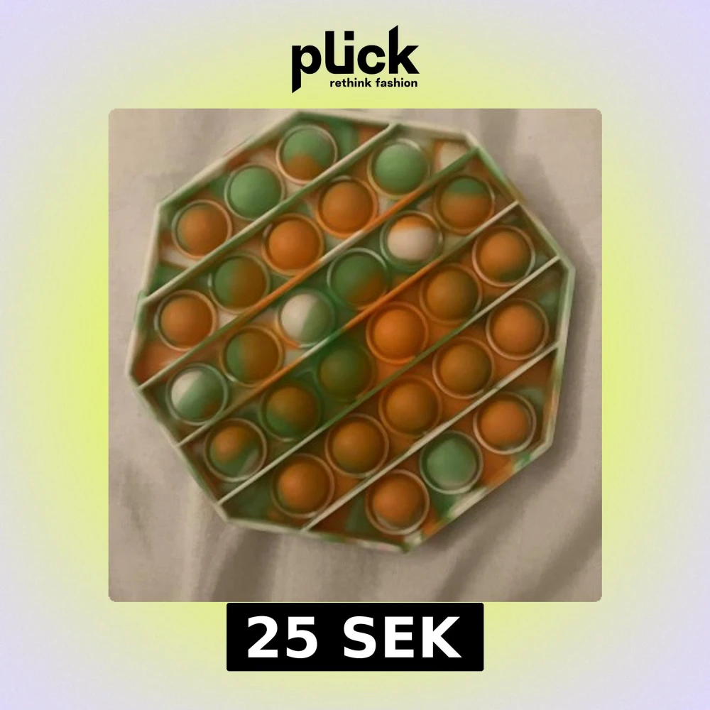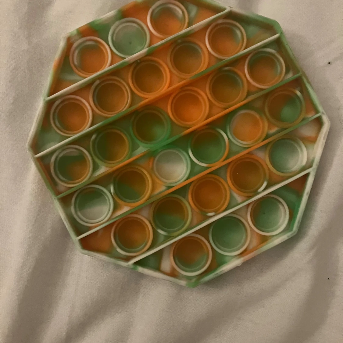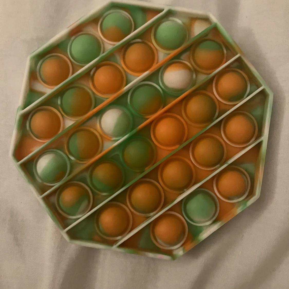 Färgglad Pop It fidget-leksak i silikon med orange, gröna och vita nyanser. Åttakantig form, perfekt för stresslindring och sensorisk stimulans. Inga synliga defekter eller slitage, i mycket gott skick.
