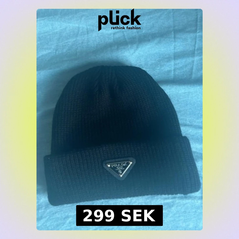 Snygg svart stickad mössa från Prada med klassisk uppvikt kant och metallmärke framtill. Mössan har en enkel och stilren design som passar perfekt till kalla dagar. Märket är i form av en triangel och ger en exklusiv touch.