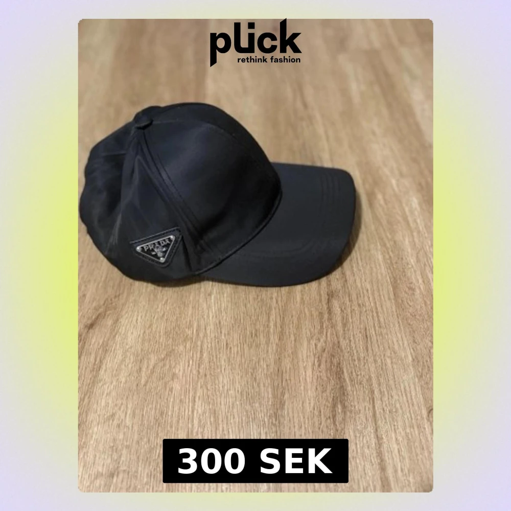 En exklusiv svart keps från Prada med en minimalistisk och elegant design. Kepsen har en böjd skärm och den klassiska triangelformade Prada-logotypen diskret placerad på sidan, vilket ger ett lyxigt men nedtonat uttryck. Den är fotograferad ovanifrån på ett ljust trägolv som tydligt visar form, material och finish. En tidlös accessoar som passar både till vardags och en mer uppklädd, modern stil.