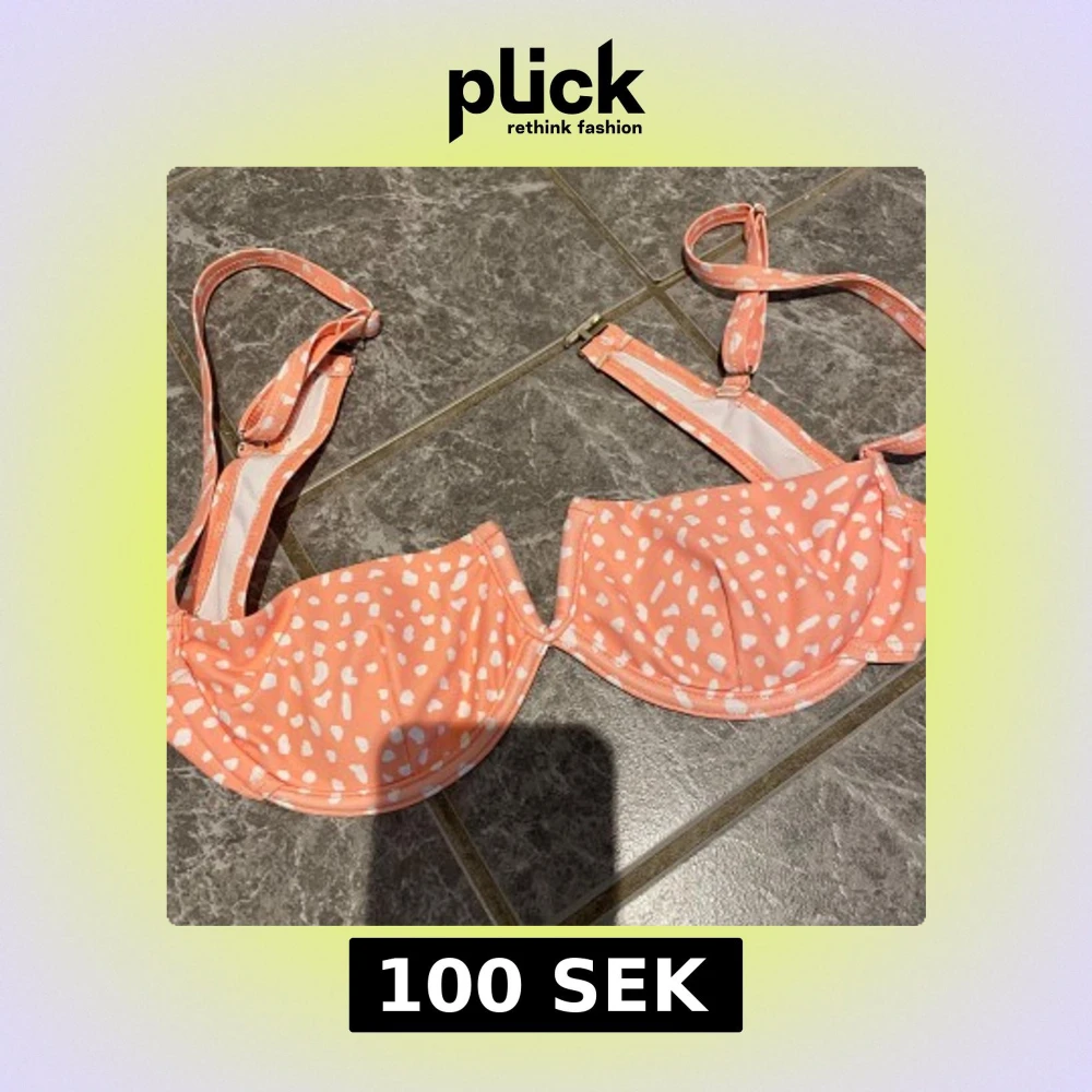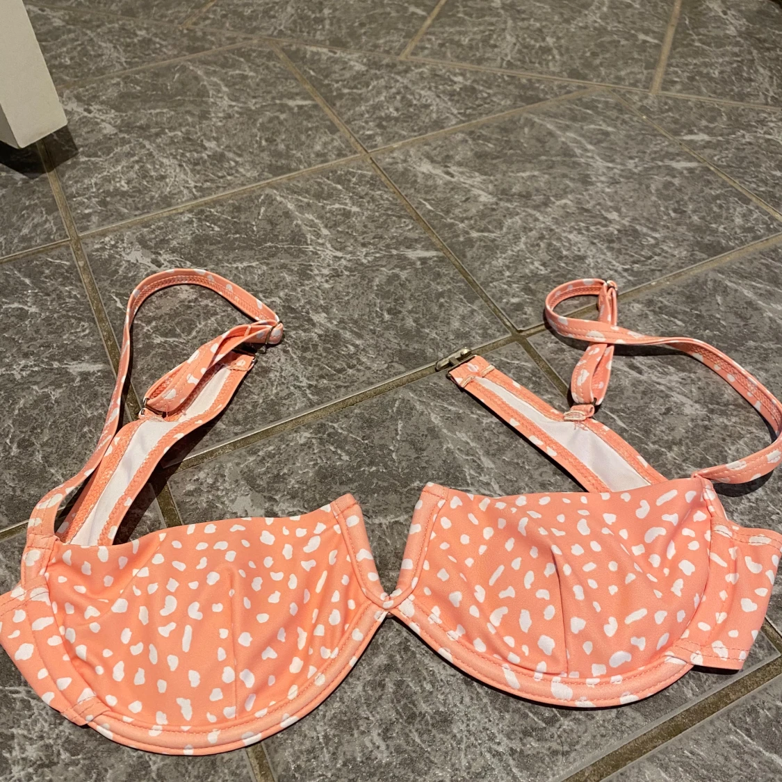 Snygg ljus rosa/orange bikiniöverdel med vita prickar. Den har justerbara axelband och en bygel för extra stöd. Använd fåtal gånger