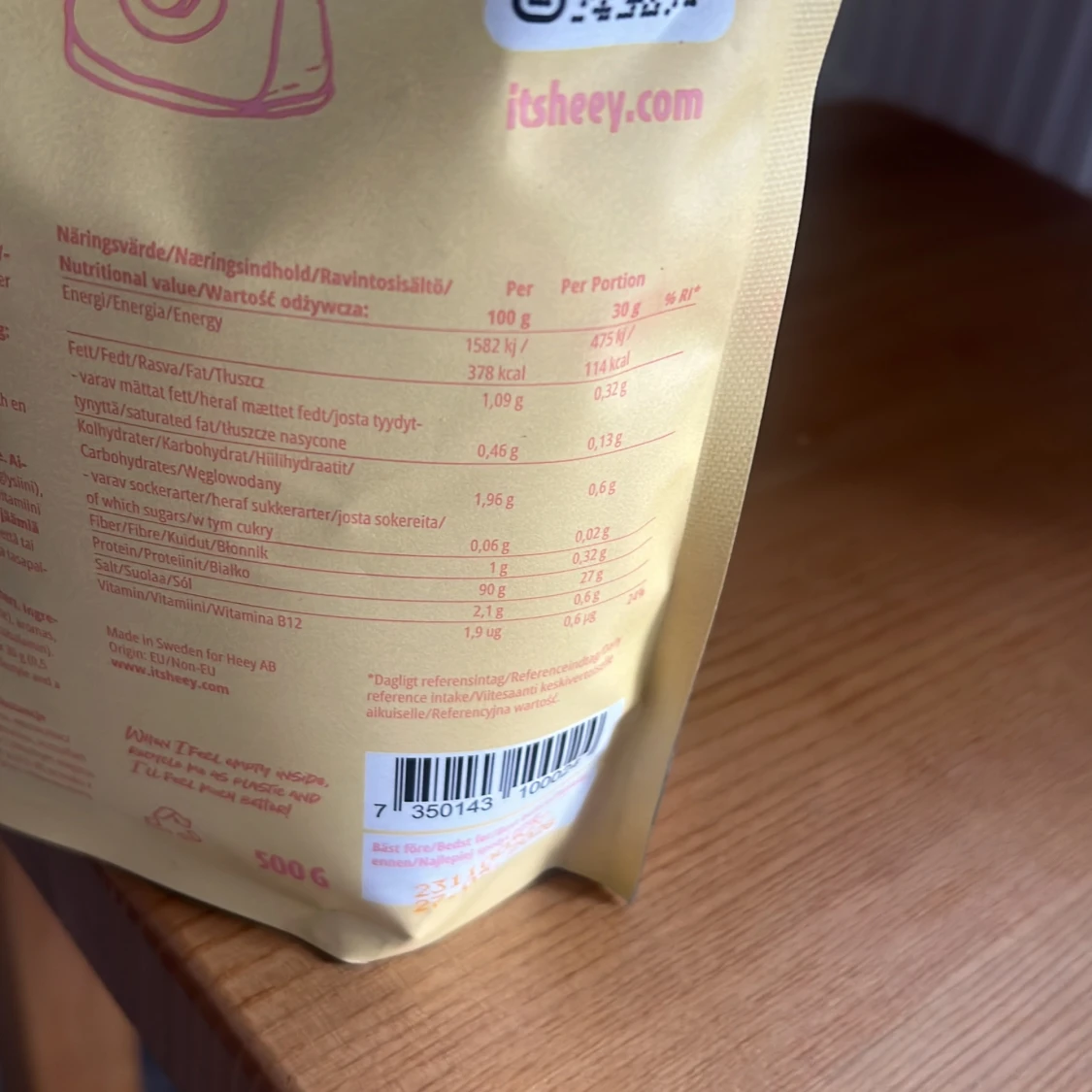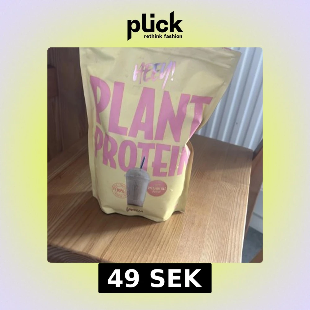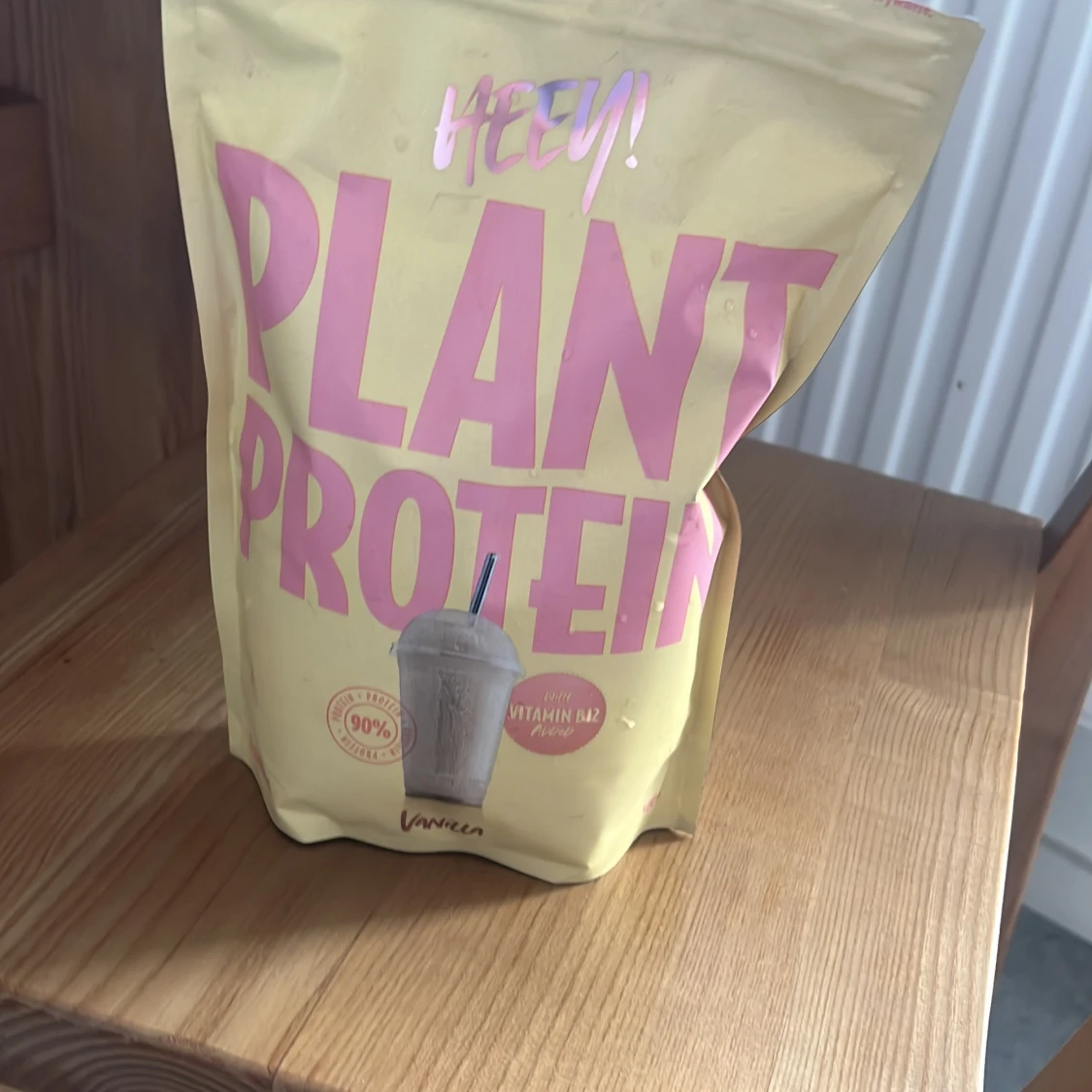 Bilderna visar en förpackning med växtbaserat proteinpulver av märket Heey! i smaken vanilj. Produkten är öppnad och i gott skick. Innehåller vitamin B12 och har 90% protein. Perfekt för dig som söker ett veganskt alternativ för träning eller återhämtning.