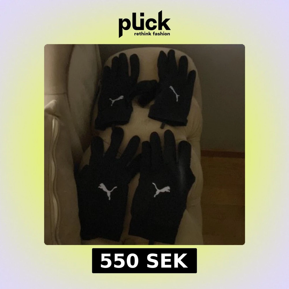 Säljer svarta handskar från Puma med vit logga på ovansidan. Handskarna har en smidig och sportig design, perfekta för kyliga dagar. De är tunna och flexibla, vilket gör dem enkla att använda till vardags eller träning.