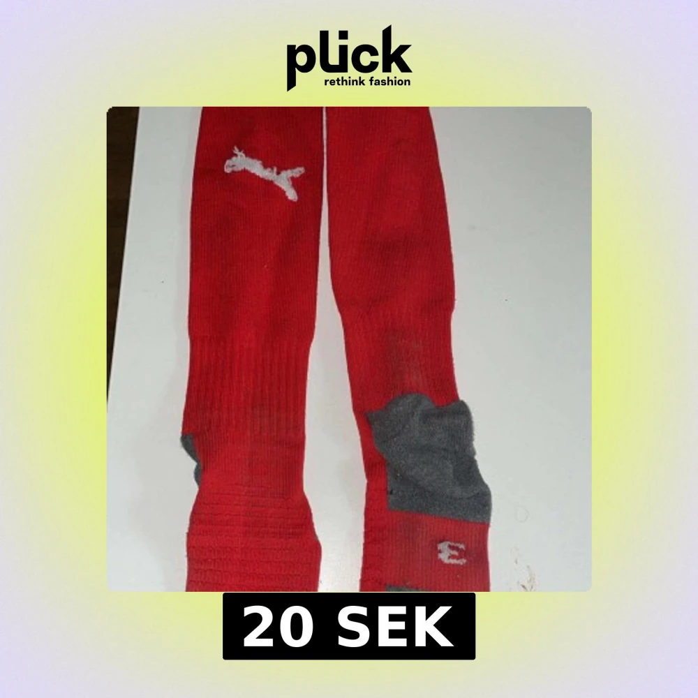 Säljer ett par långa röda fotbollsstrumpor från Puma med grå förstärkning vid foten och vit Puma-logga på skaftet. Strumporna är ribbade vid vristen för extra stöd och har en sportig look som passar perfekt till match eller träning.