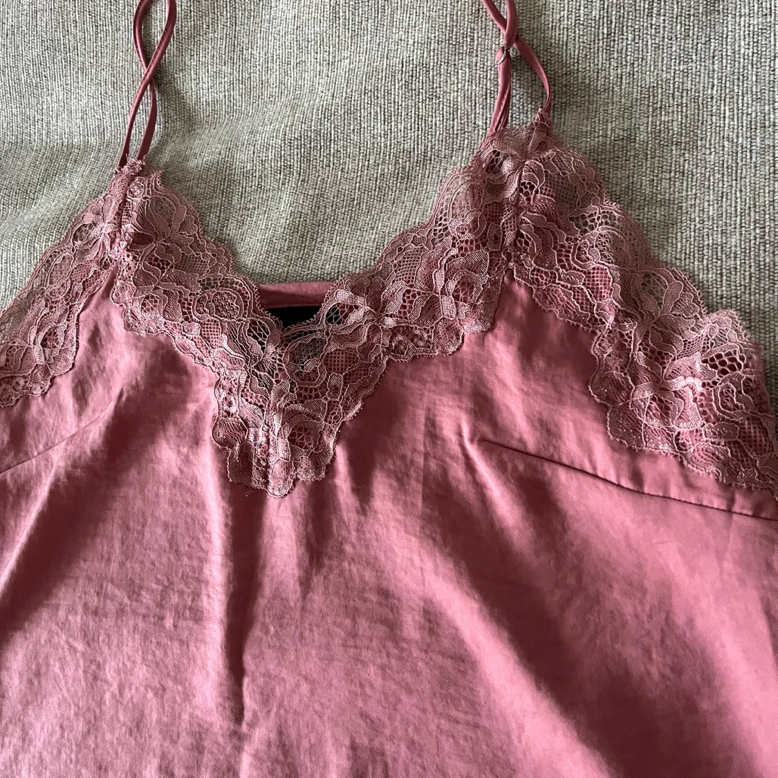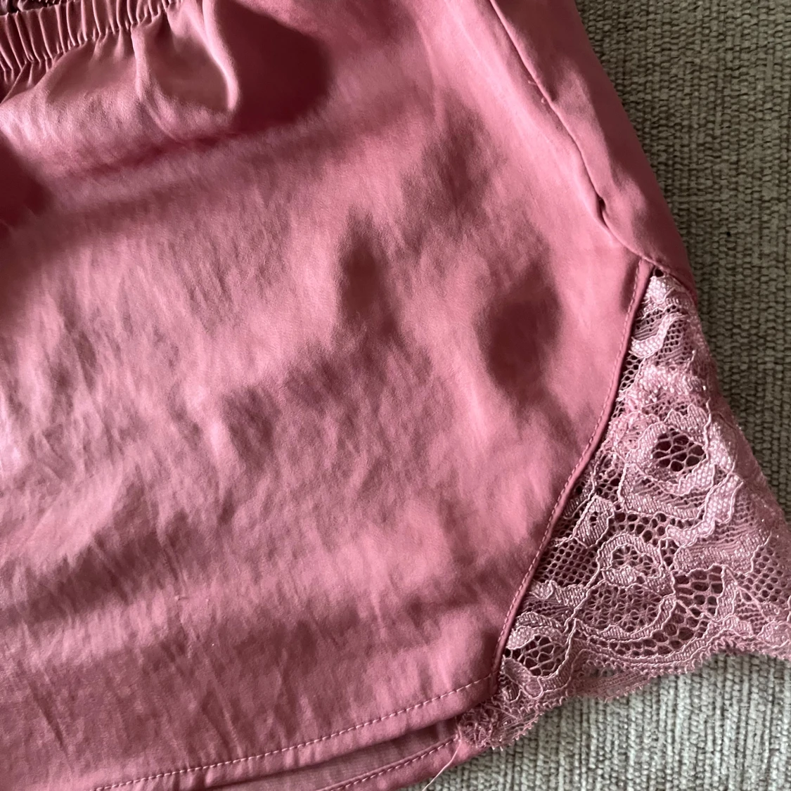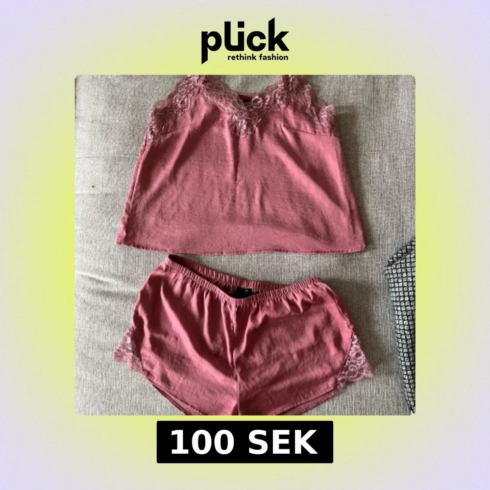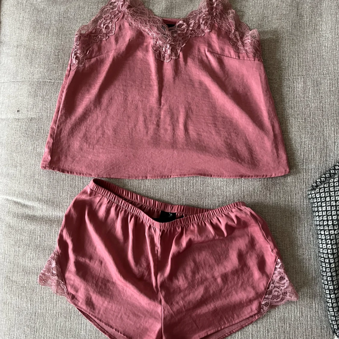 Rosa pyjamasset (linne+shorts) med spets från H&M i storlek S. I mycket fint skick, som ny då använt max 2 ggr. 100% polyester. Mått linne: Längd ca 55 cm enligt bild (justerbar till mer/mindre) Byst ca 45 cm Midja ca 48 cm Mått shorts: Inre längd ca 5 cm Yttre längd ca 24 cm Midja ca 35 cm (elastisk) Stuss ca 43 cm