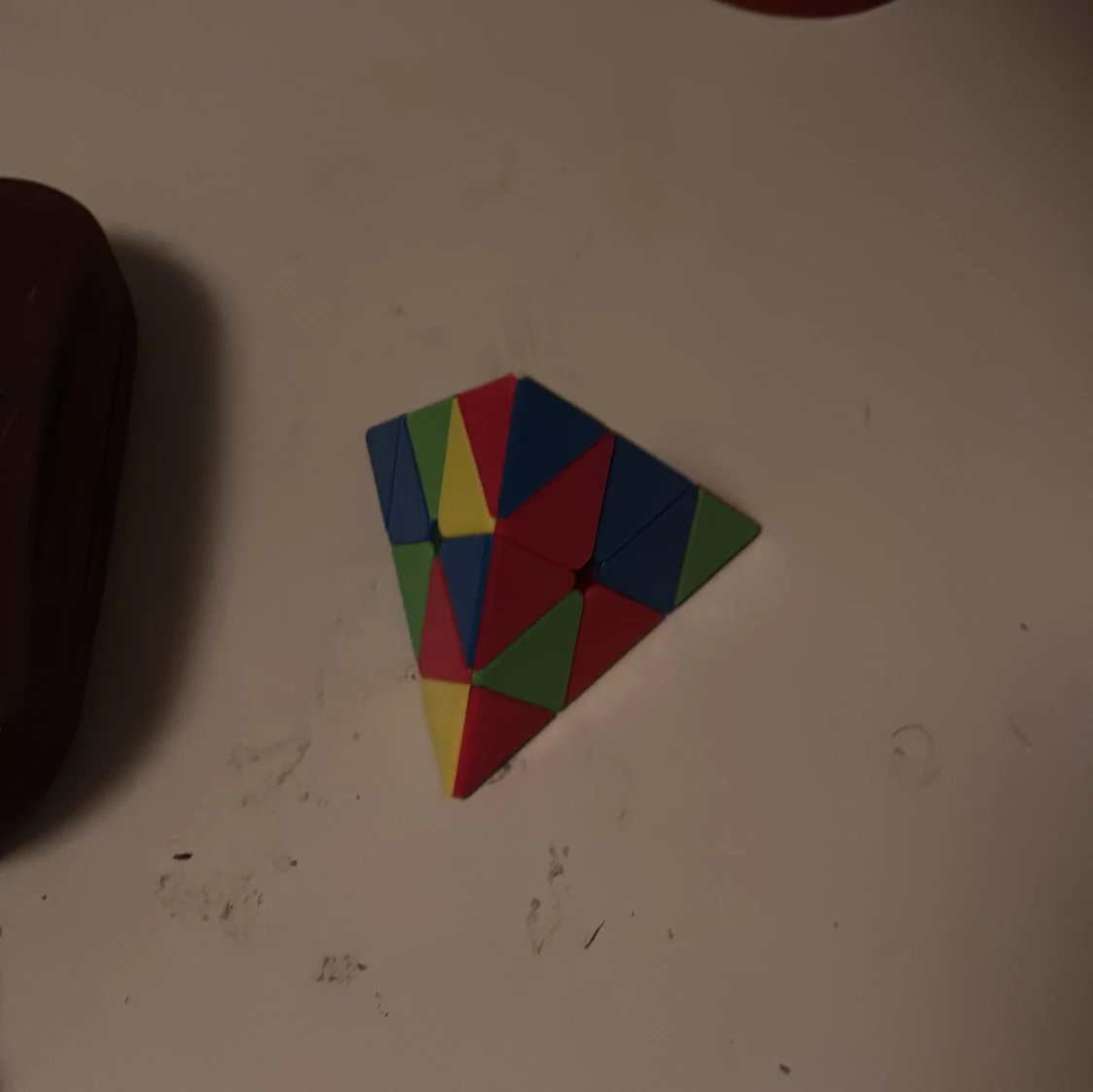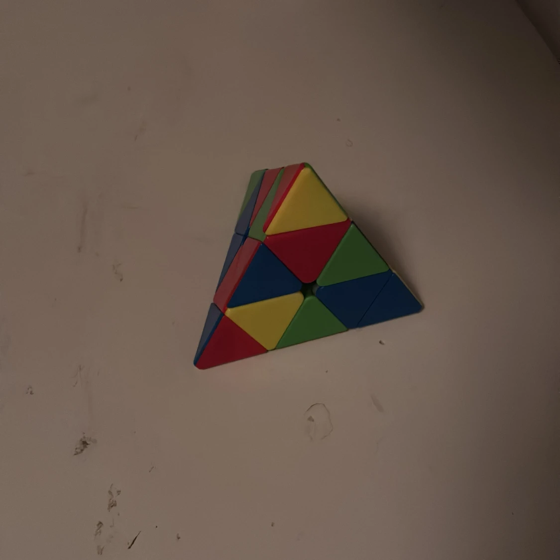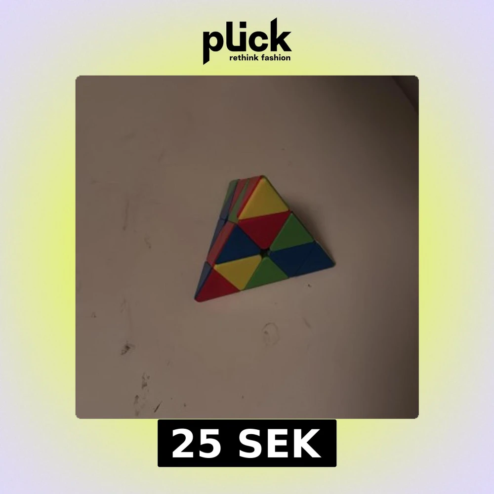 Färgglad Pyraminx, en triangulär Rubik's Cube-liknande pussel. Bra skick, alla färger synliga och inga synliga skador. Perfekt för pusselentusiaster som vill ha en utmaning utöver den klassiska kuben.