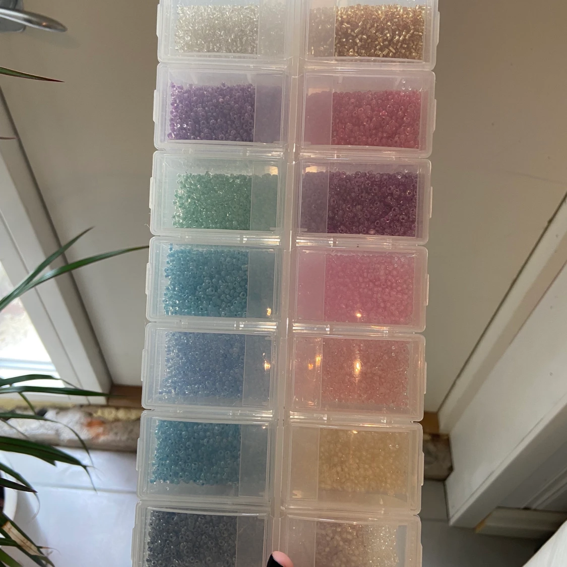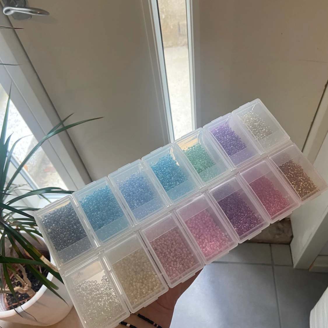 Pärlor från panduro (tror jag). Det mesta av pärlorna är oanvända förutom de vitala de gröna.💕