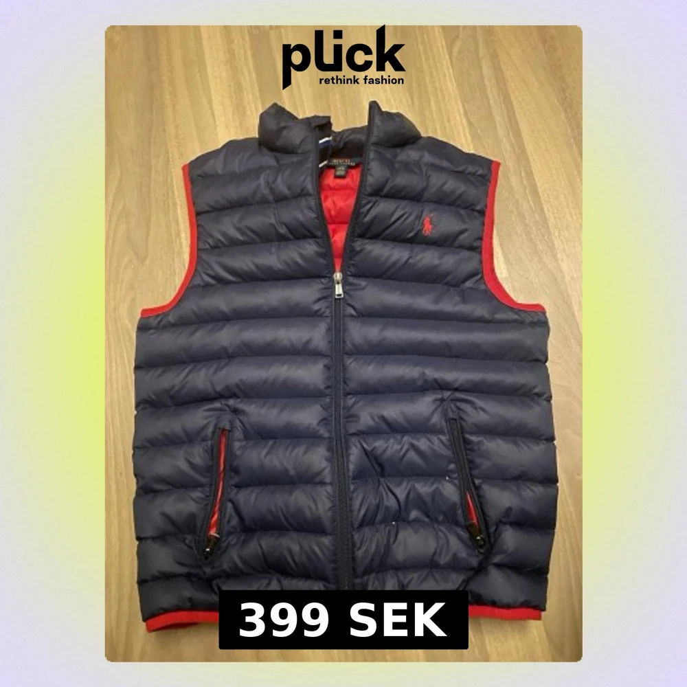 Snygg mörkblå dunväst från Polo Ralph Lauren med röd kant och röd logga på bröstet. Västen har quiltad design, två fickor med dragkedja och hög krage. Perfekt att slänga över en hoodie för extra värme. Stängs med dragkedja framtill.