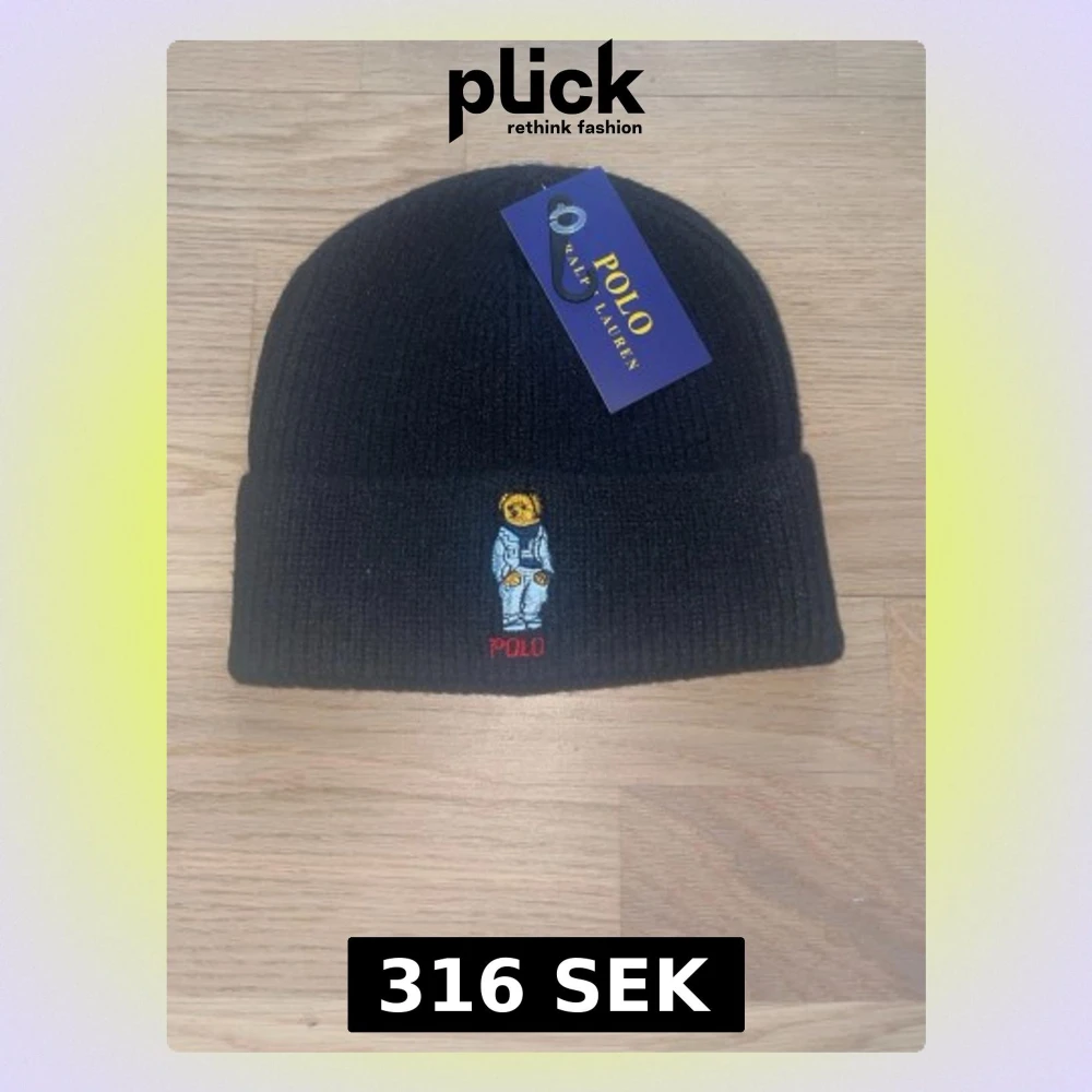 Svart ribbstickad mössa från Polo Ralph Lauren med broderad nalle på framsidan och uppvikt kant. Märkeslapp på insidan. Perfekt för kalla dagar och snygg detalj till din outfit.