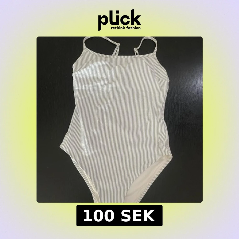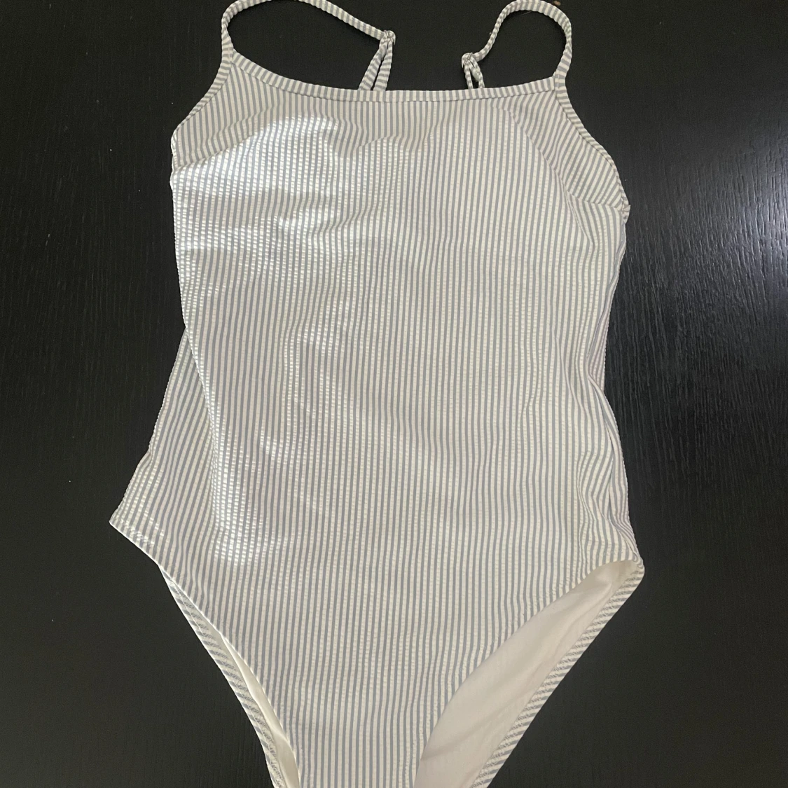 Snygg baddräkt med smala axelband. Inlägg i brösten. Mönstret är randigt i vitt och ljusblått. Använd några få gånger.
