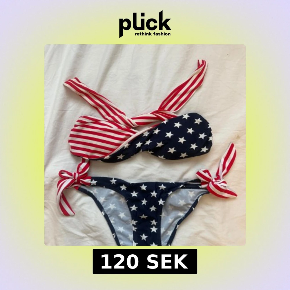 Cool bikini från Lebole med bandeau-topp och knyt i sidorna. Toppen har röda och vita ränder, medan både topp och trosa har marinblå botten med vita stjärnor. Materialet är mjuk polyester och elastan, perfekt för stranden. Snygg och unik design som sticker ut!