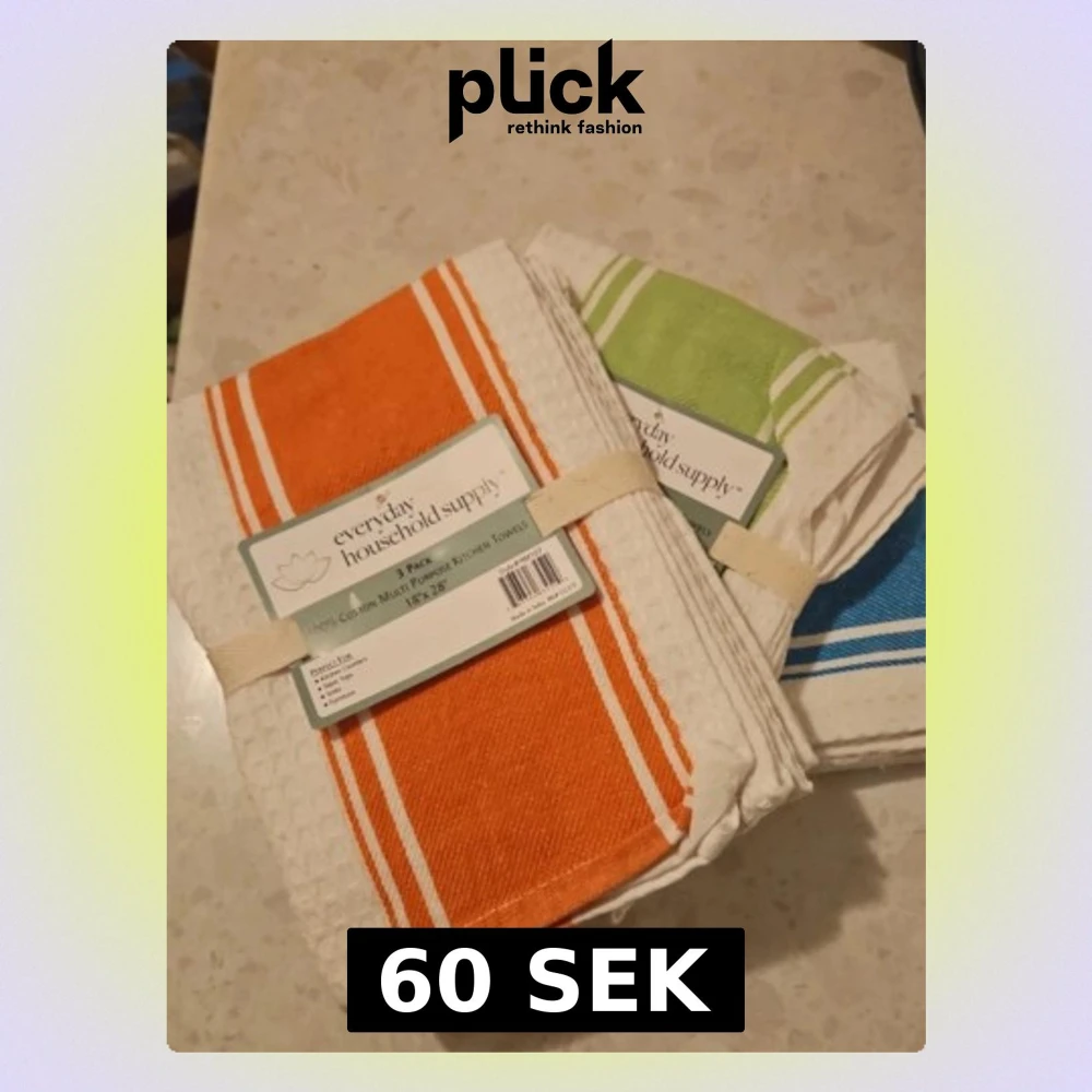 Säljer ett 3-pack x 3 st kökshanddukar i 100% bomull från Everyday Household Supply. Handdukarna har randigt mönster i orange,