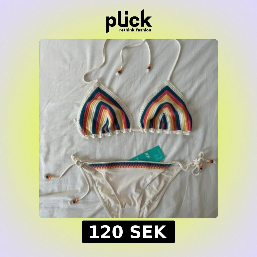 Superfin bikini från H&M med virkade detaljer i vitt, blått, rosa och gult. Toppen har trekantsform och knytband med färgglada pärlor. Underdelen har matchande virkade ränder och knyt i sidorna. Perfekt för stranden och sommarens alla bad