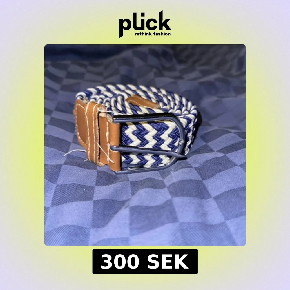 Snyggt flätat bälte i blått och vitt med bruna skinn-detaljer vid spännet. Bältet har ett randigt mönster och ett silvrigt metallspänne. Perfekt accessoar för att lyfta din outfit med en sportig och fräsch känsla.