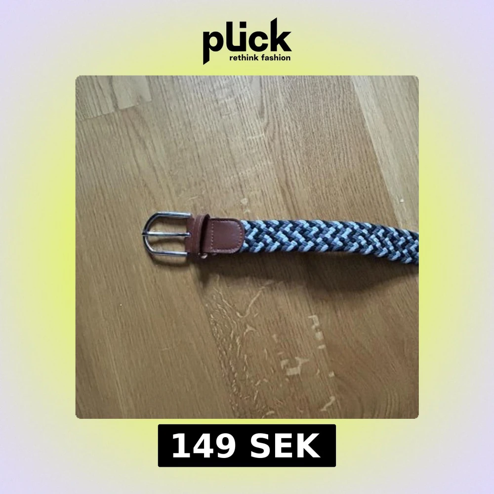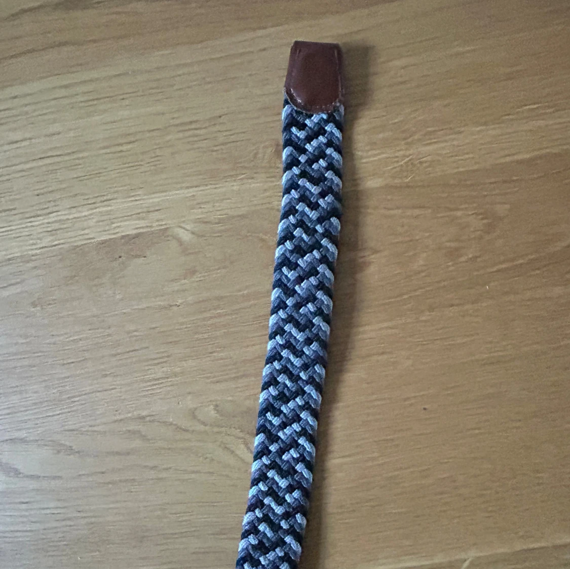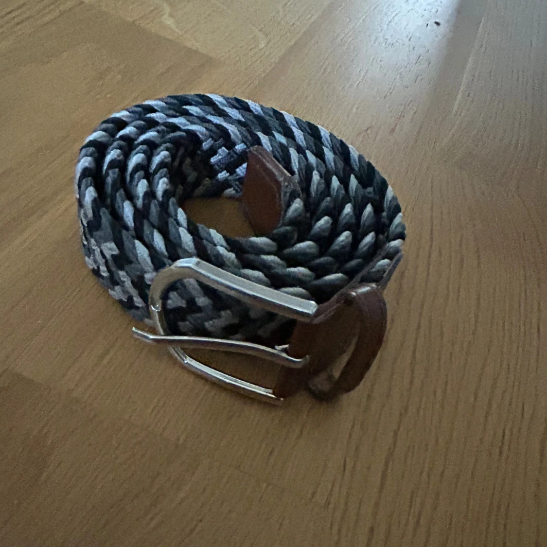 Snyggt flätat bälte med randigt mönster i svart, grått och vitt. Bältet har bruna skinn-detaljer vid spännet och änden, samt ett silvrigt metallspänne. Perfekt för att ge outfiten lite extra edge och passar till både jeans och chinos.