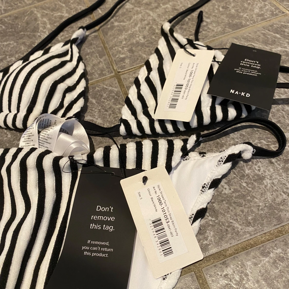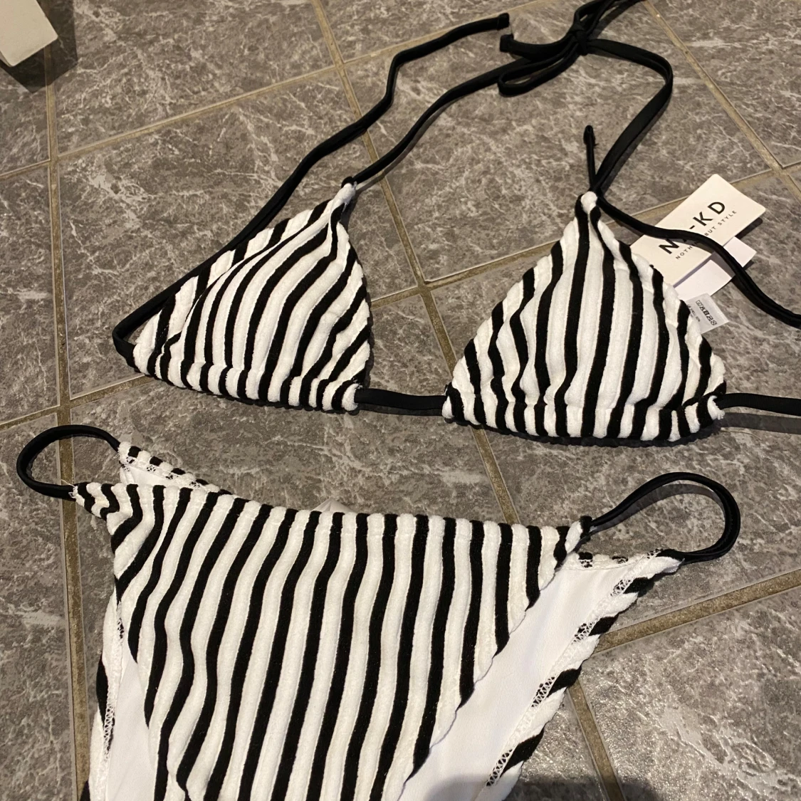 Snygg svartvit randig bikini från NA-KD med knytband. Triangelformad topp och matchande underdel. Helt oanvänt med alla lappar kvar